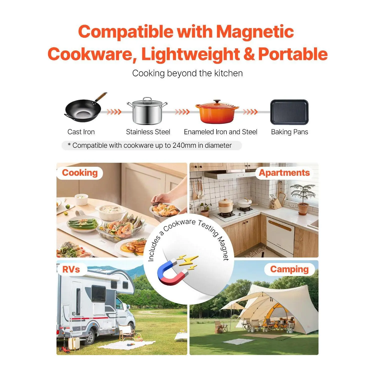 • Versatile Use: Compatible with magnetic cookware (up to 240mm in diameter), such as cast iron, stainless steel, enameled iron and steel. Its lightweight, portable design suits daily home use, gatherings, rental apartments, RVs, and camping trips.