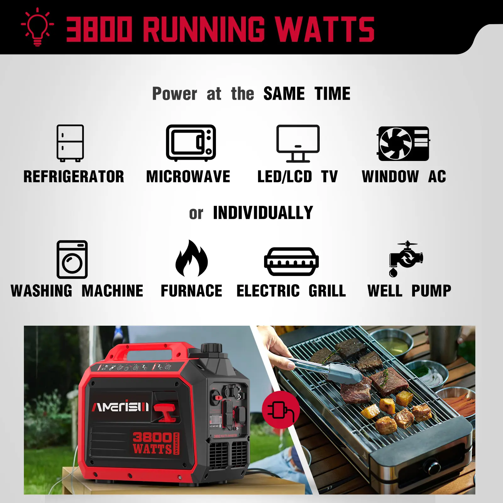 ·STRONG POWER FOR HIGH OUTPUT: The 3800W inverter generator is powered by a 149cc gas 4-stroke OHV single-cylinder engine, with forced air cooling system, providing reliable support for home backup emergence use