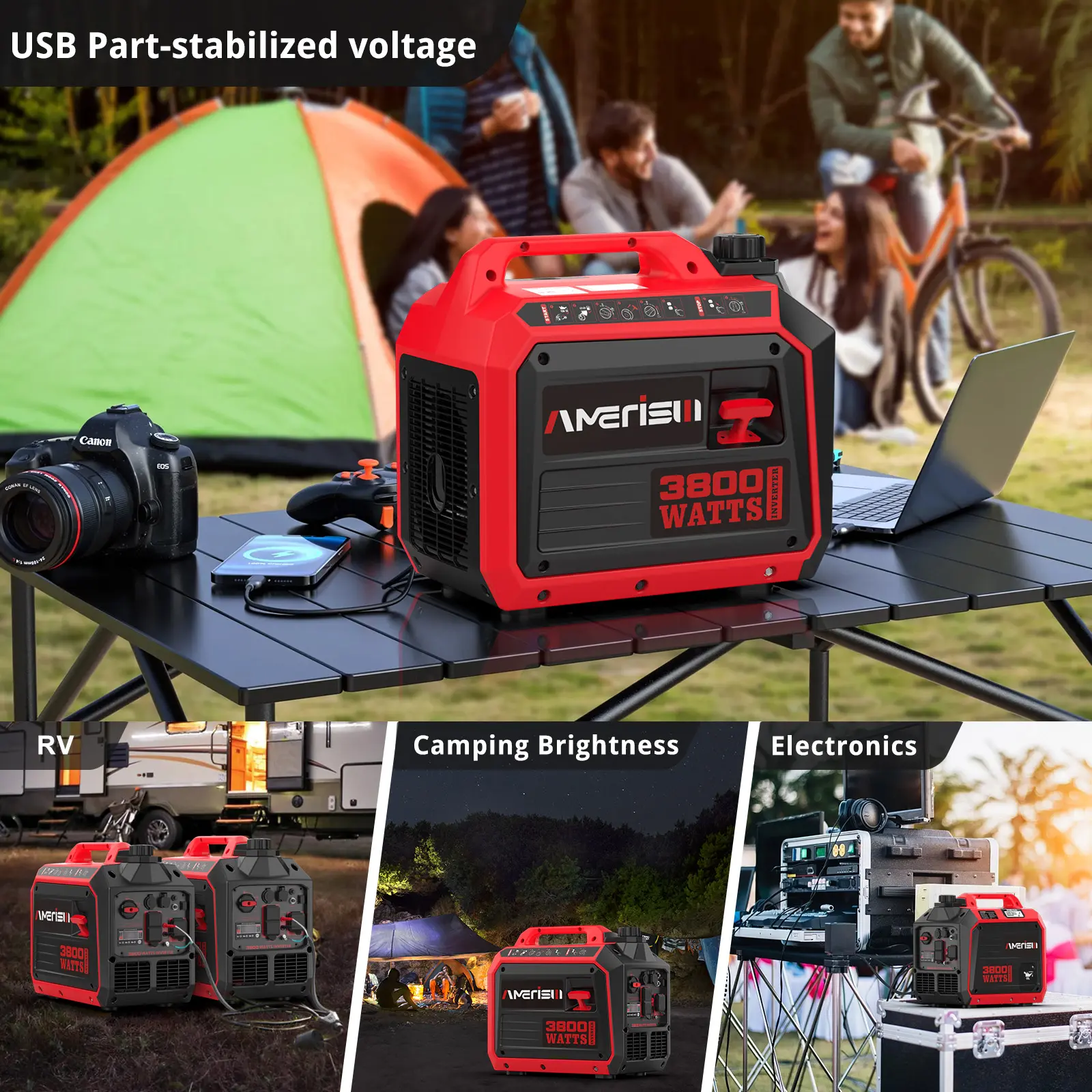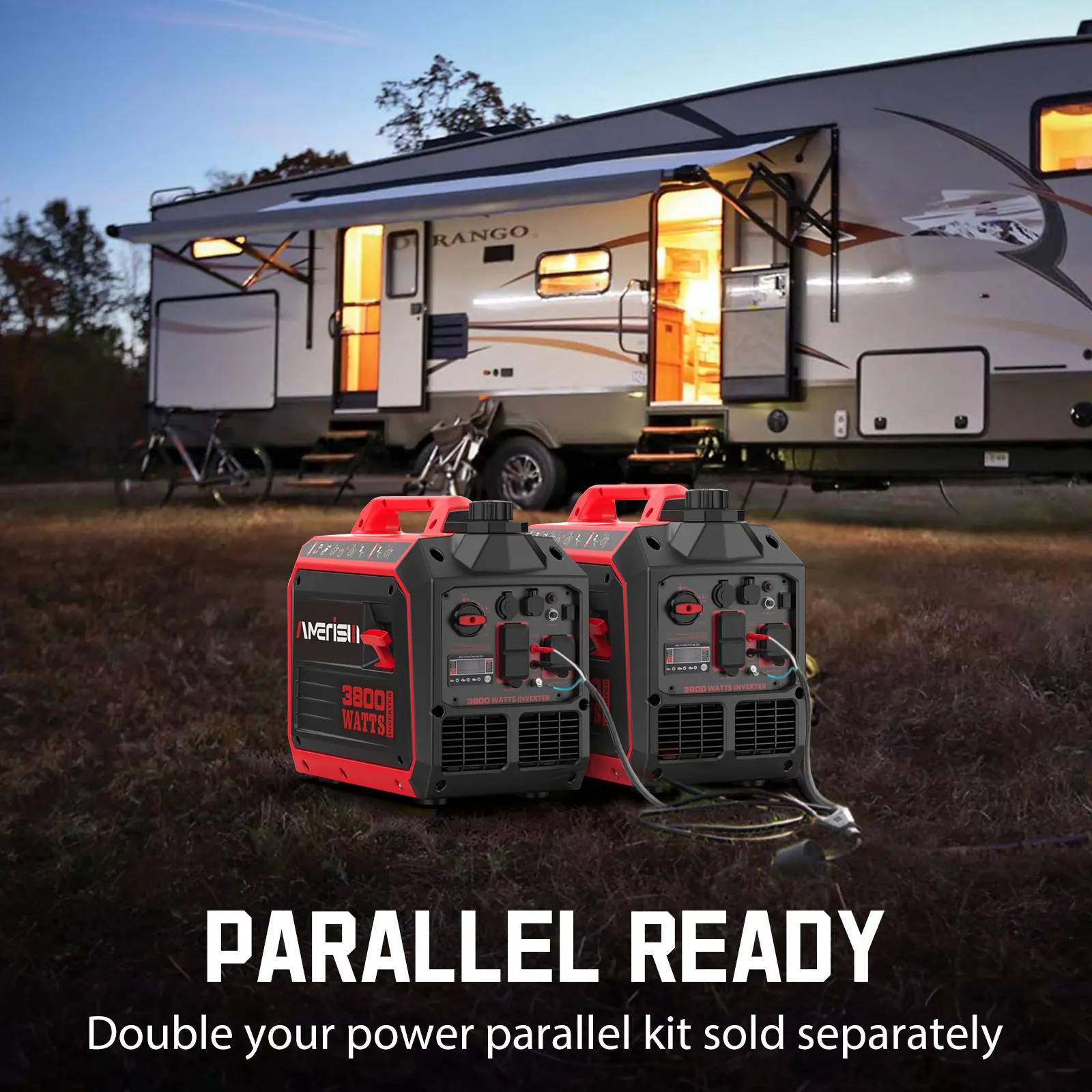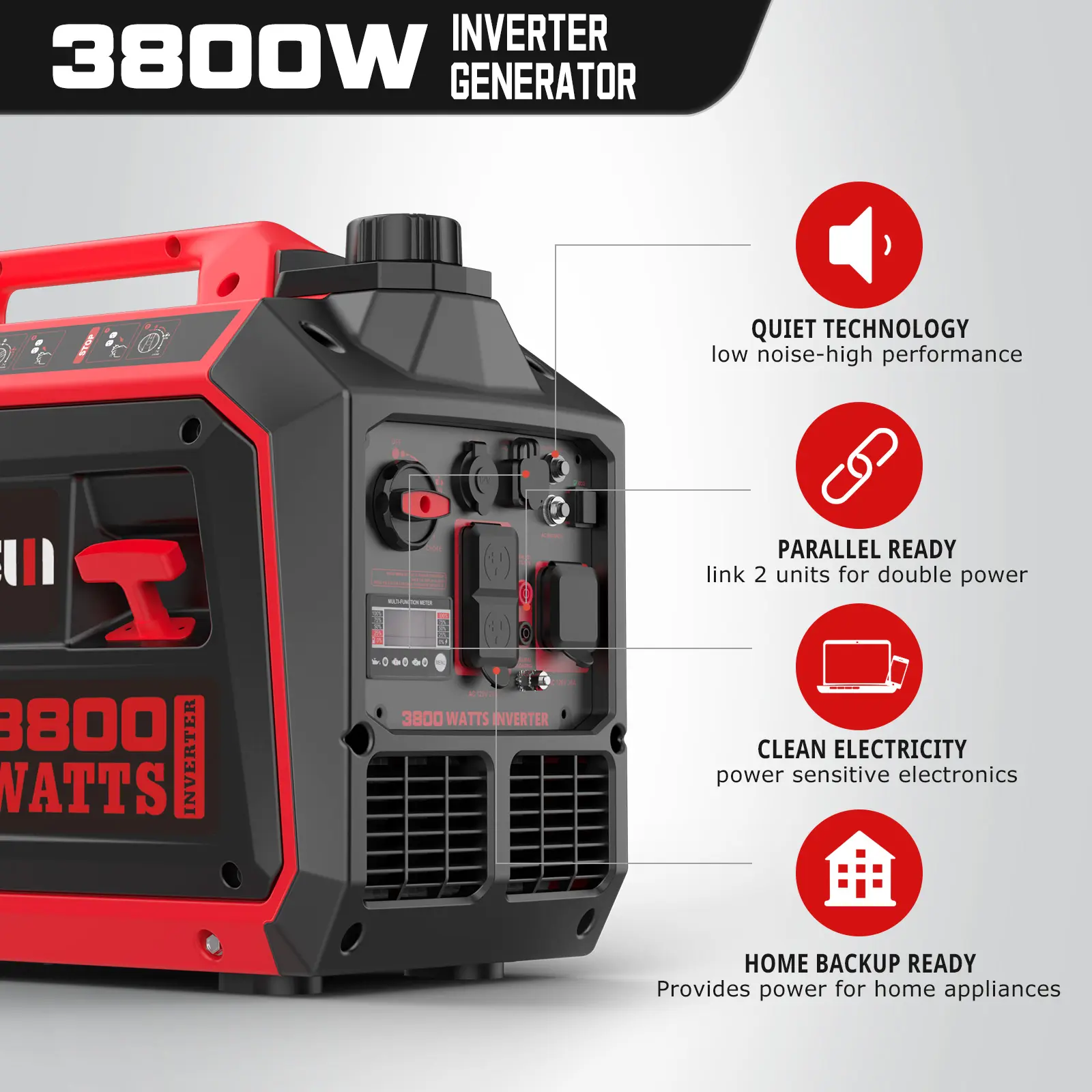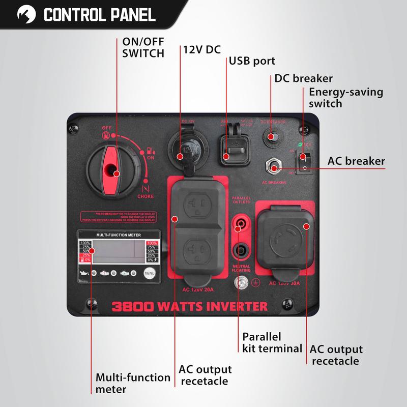 ·VESATILE POWER SUPPLY: Equipped with 2 AC outlets (120V), 1 USB-A ports (5V), and 1 DC car port (12V). this inverter generator is parallel ready, you can also connect another 3800-watt inverter generator equivalent provide up to 5800 watts of power