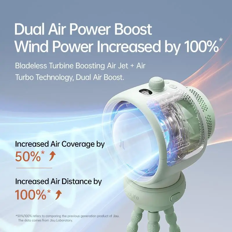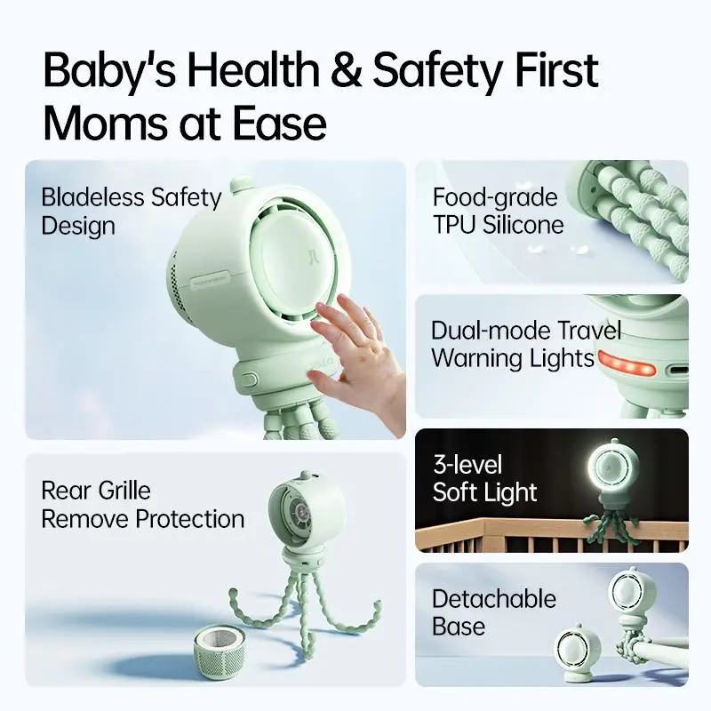 You get peace and quiet with acoustic noise reduction and eye-care lighting with adjustable brightness. Available in stylish green or brown with powerful lithium-ion batteries, this fan is a must-have for stroller rides, car seats, or anywhere you need fresh air. Ready to breeze through summer? Grab your Jisulife fan today and keep cool in style!