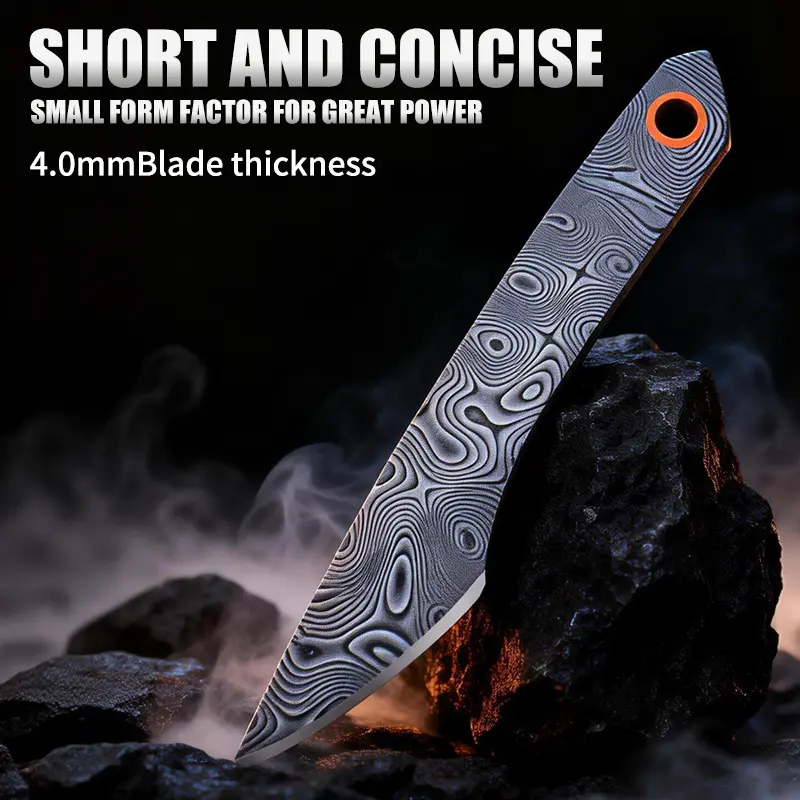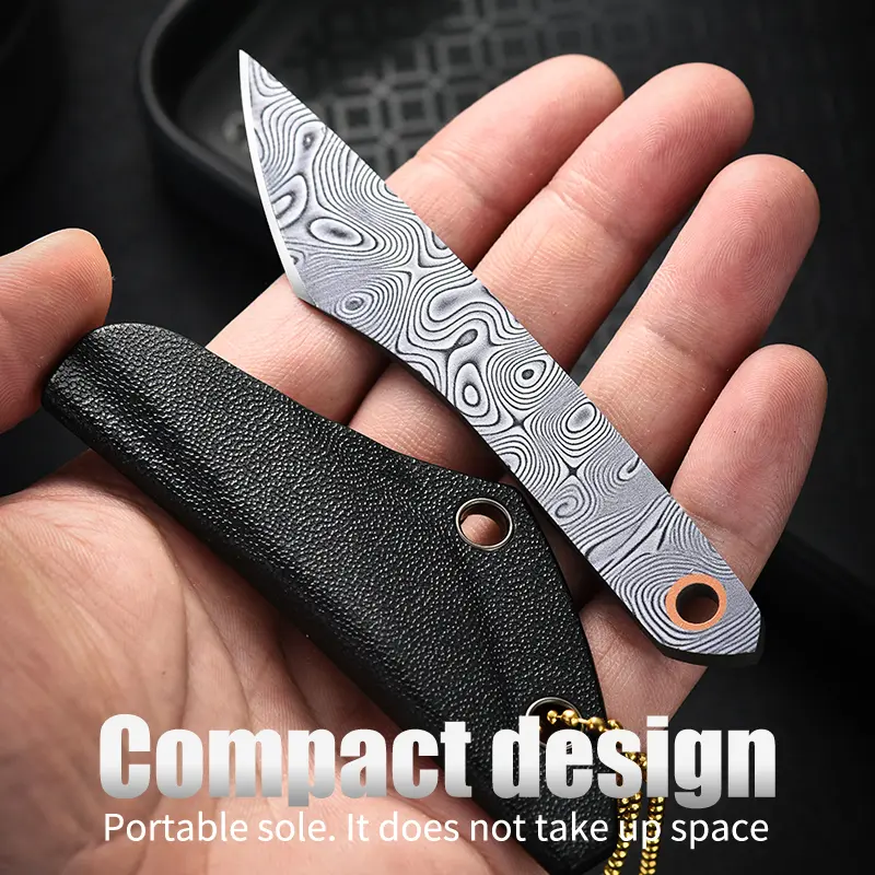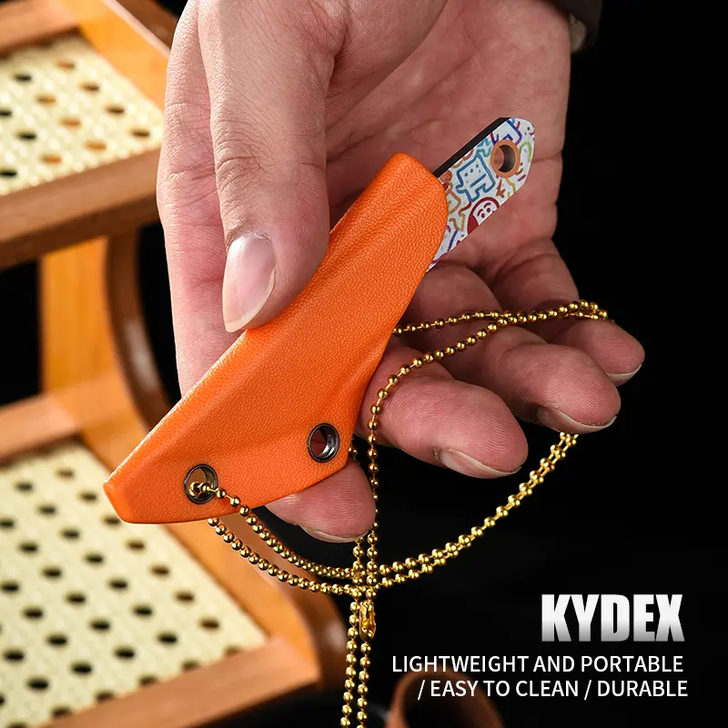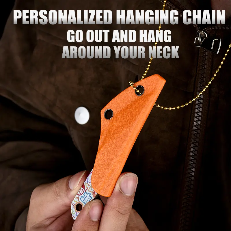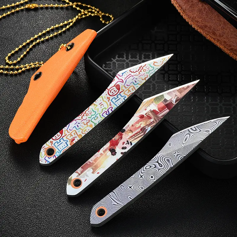 This is a set of portable straight-edged knives with diverse blade designs: colorful cartoon graffiti styles, Chinese-style illustration styles, and Damascus steel texture styles. The blades are sharp and compact. The end of the handle is equipped with a lanyard hole, allowing it to be hung and carried with a gold bead chain, and it comes with an orange portable knife sheath. Lightweight and easy to store, it is suitable for daily package opening, outdoor emergency handling, and portable daily use, combining both aesthetic appeal and practicality.