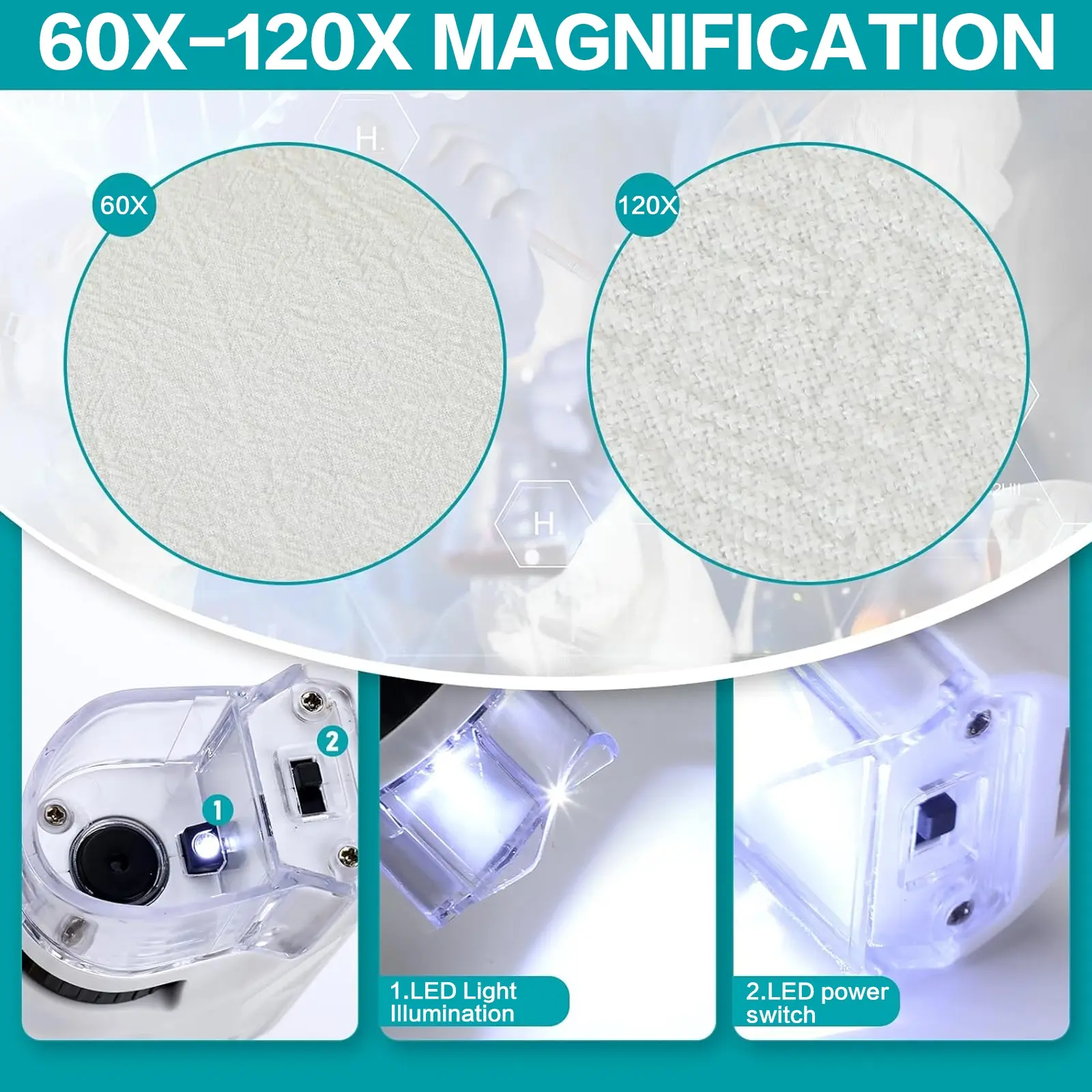 Portable Kids Pocket Microscope, 120X High Magnification with LED Light. STEM Science Lab Toy Set for Students. Perfect Gift for Christmas, Halloween, Thanksgiving & Birthdays. Explore Nature Tool for Children.