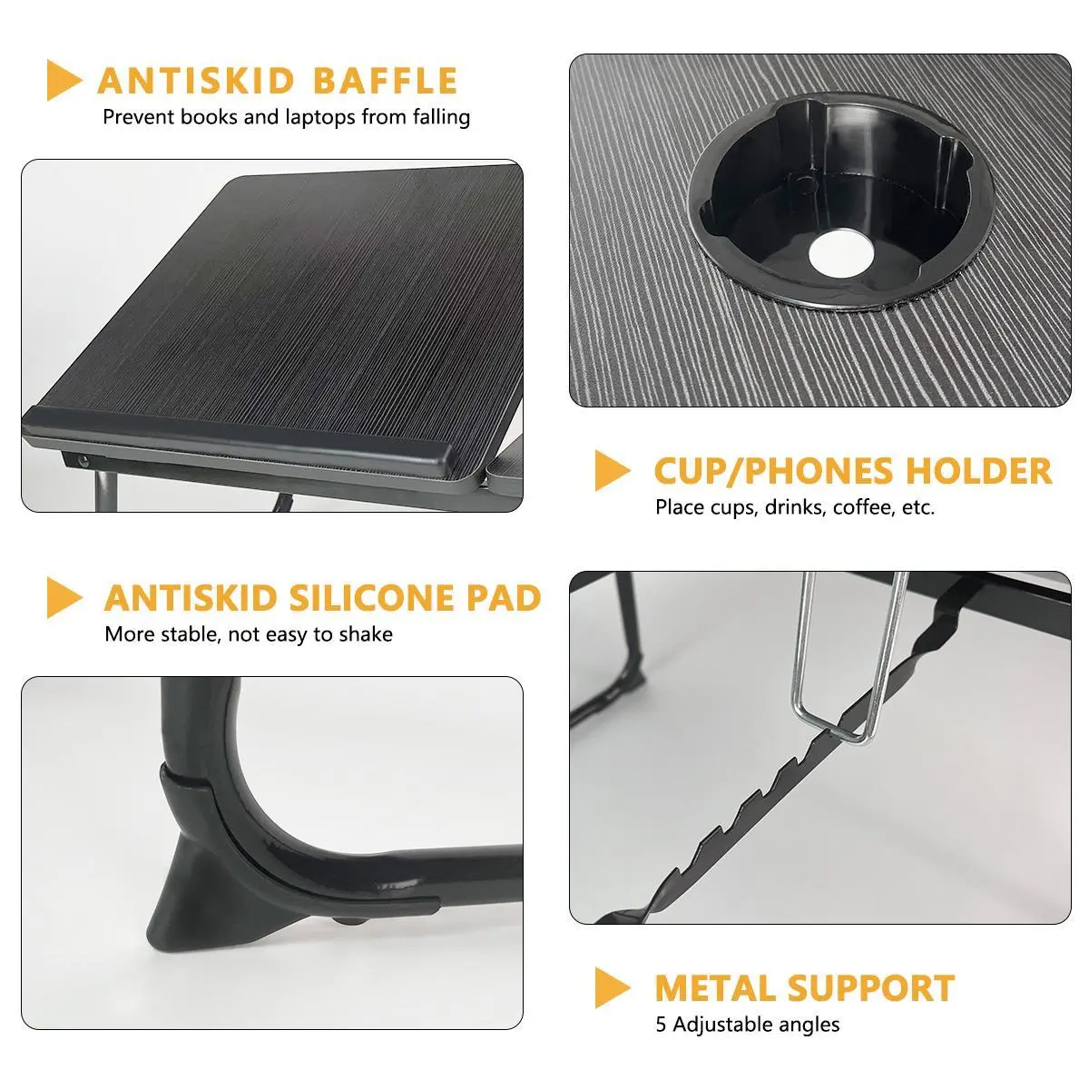 This foldable wooden computer tray is perfect for reading and writing on bed, sofa, or floor.It features a sleek black design and a tiltable tabletop.The sturdy modern portable table includes a cup holder and drawer.Ideal for laptops, books, and other essentials.📚💻