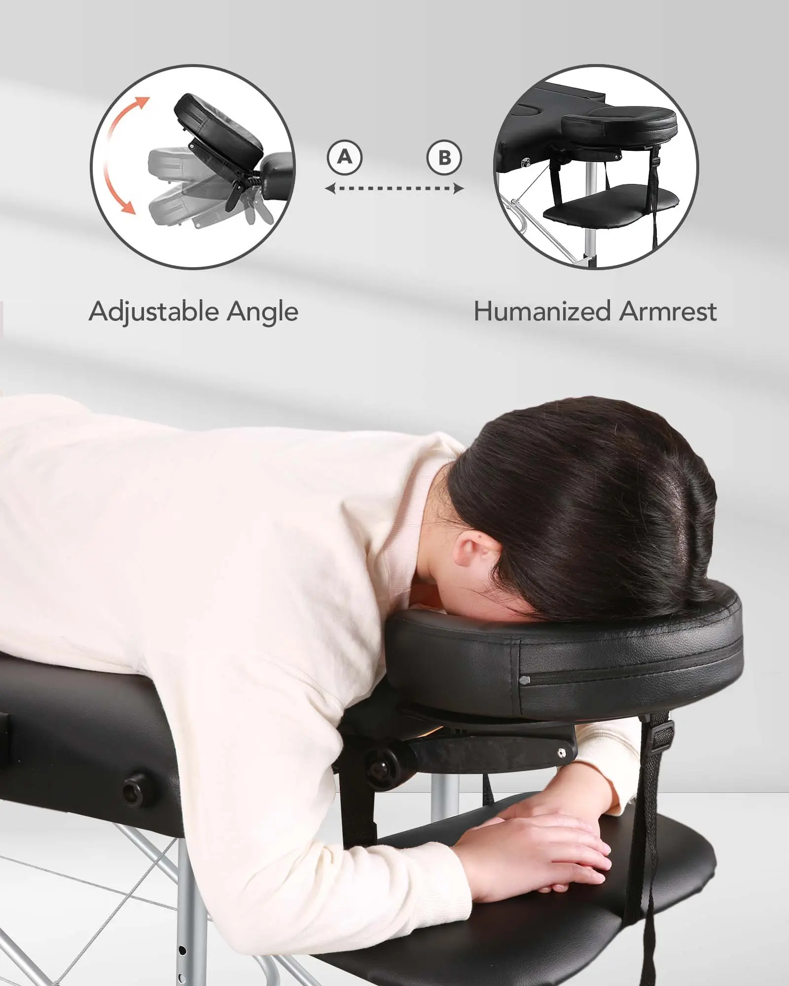 ·Detachable Headrest & Armrests Massage Table: The headrest and armrests of this massage table are detachable for your convenience, fixing with bungee in case of losing. And the headrest can be adjusted up and down. The headrest of massage table is connected with handle pallet underneath, ensuring you a more comfortable arm and head position.