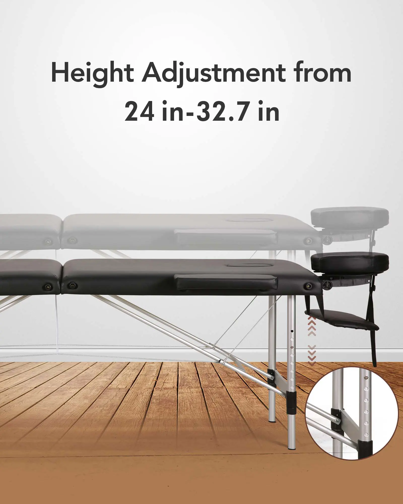·9 Adjustable Heights Massage Table: The massage table has 9 levels of adjustable heights, ranging from 24 inches to 32.7 inches with easy adjustment, you only need to press the small round knob on the leg to complete the height adjustment. The massage table with 9 levels adjustable heights are suitable for therapists of different heights, who provide customers with excellent service.