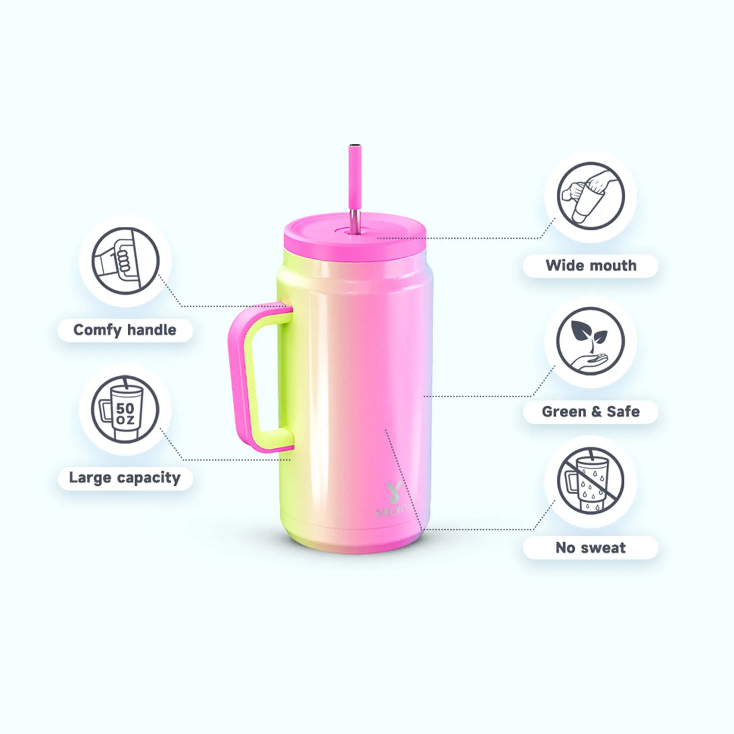 Love, love, love this! For those of us, trying to get it a gallon of water a day. This is perfect! Also, the fact that it’s a 50 ounce and stainless steel is fantastic! My new Meoky will sit at my desk every single day❤️🙌❤️