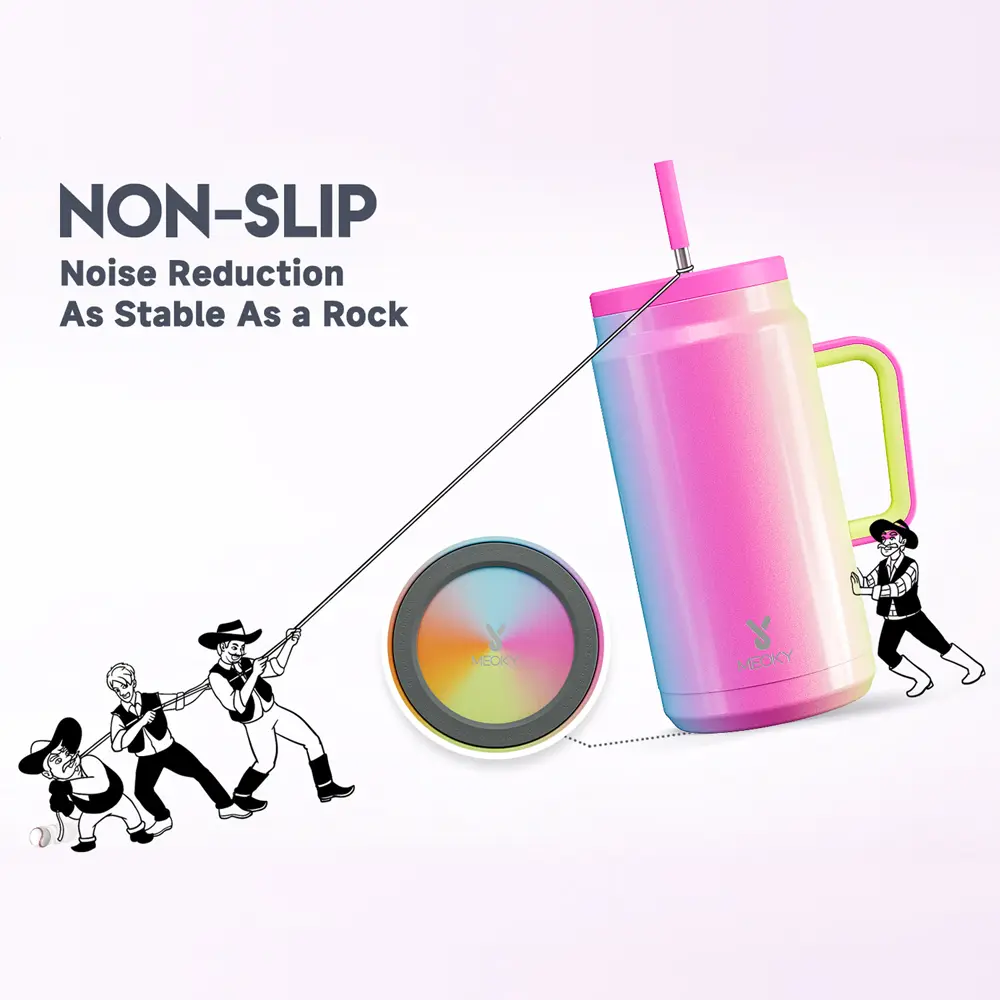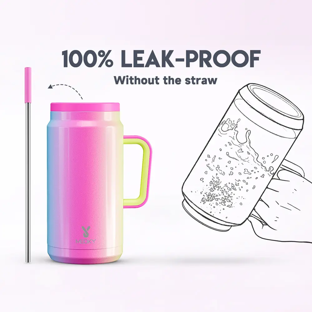 Absolutely love everything about this cup! The colors are beautiful, the grip bottom and handle are great, love that it comes with the metal straw with rubber end, 100% does not leak when straw is out, and barely leaks out when straw is in if knocked over.