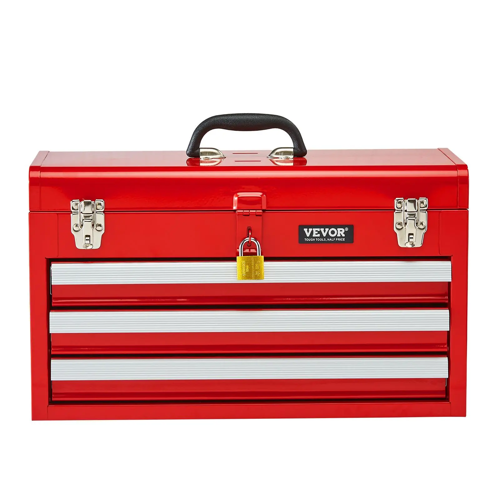 • Auto-locking for Enhanced Security: The steel tool box features an auto-locking system. Simply push the drawers in and close the top lid to lock it, avoiding accidental sliding and securing your tools. The heavy-duty metal latch keeps the top securely in place, while an additional lock hole allows you to add a lock for extra security, ensuring your valuable items are secure. (Note: To access the drawers, unlock by opening the top lid first.)