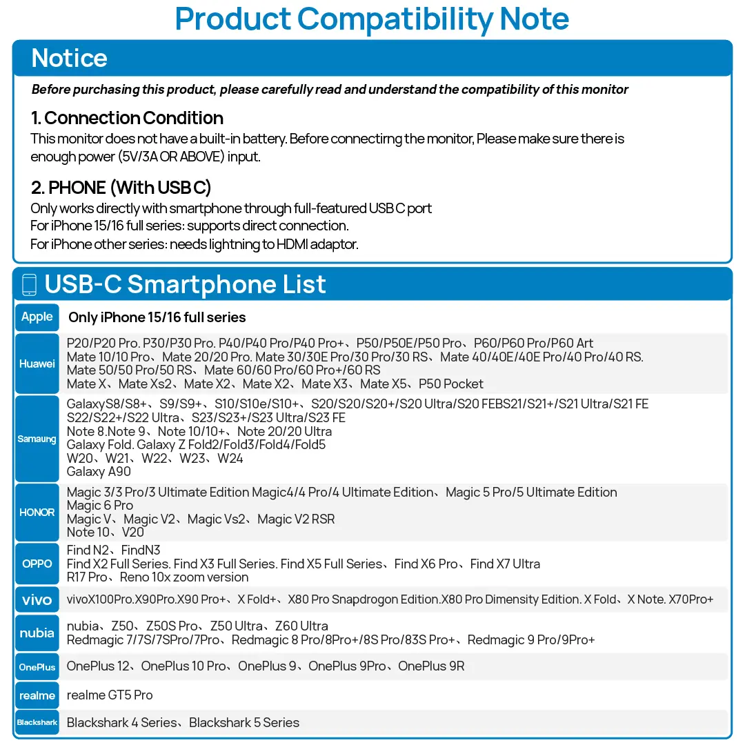 ·Streamline your setup process with easy plug-and-play functionality, requiring only one USB-C cable for both video signal and power transmission (phones require full-featured USB ports), eliminating the need for additional drivers or applications and ensuring a hassle-free experience from the get-go.