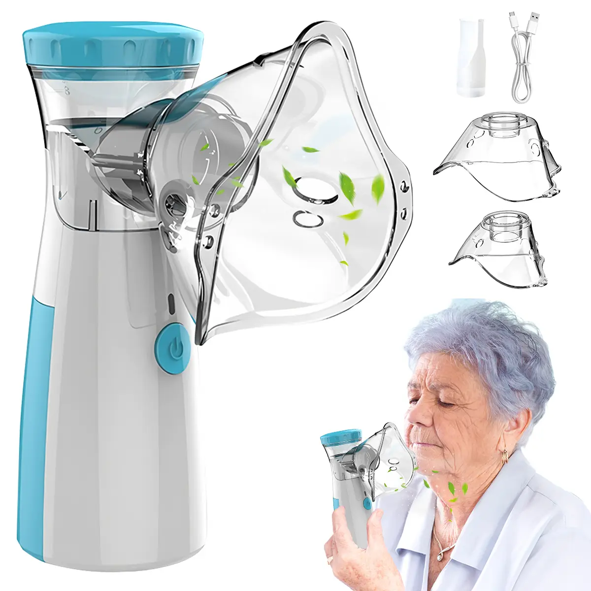 Inside the box: your portable mesh nebulizer, USB charging cable, mouthpiece, and user manual.