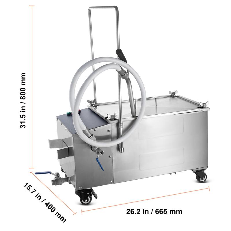• 38L Large Capacity: The oil tank can hold 38L/10 gal of oil with a filtering speed ≥10 L/min, meeting your commercial needs for quickly filtering large amounts of oil. With a compact design of 26.2" x 15.7" x 31.5"/665 x 400 x 800 mm (including the pole), our fryer filter fits snugly into any kitchen, leaving you with plenty of room to maneuver.