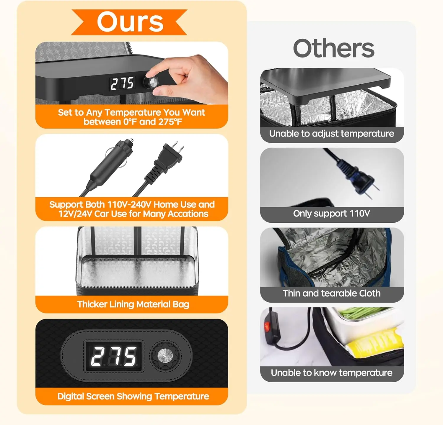 ·Upgraded Adjust Temperature Digital Display Portable Oven: the Heated Lunch Box supports Intelligent Adjustable Temperature and Digital Display, you can directly to notice the temperature in the box, it adopts advanced conduction heat technology to ensure that your meals are cooked evenly, without drying them out, the heated lunch box retain their moisture and freshness. to adjust the temperature to satisfied difference food heating Temperature Requirements, also can avoid burn.