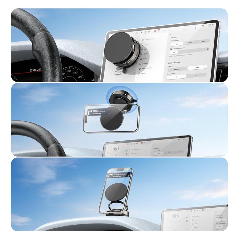 ·【Vacuum Power, No Marks Left Behind】 This magnetic phone holder has vacuum power with a strong 3kg suction. Press, twist, —no marks left behind. Works on smooth surfaces like car dashboards, bathroom tiles, kitchen counters, gym equipment. No charging or sticky glue needed—no more ruined leather or wood! Light and portable, so you can easily move it between your car, hotel room, or camping table. Super convenient and ready for your next adventure.