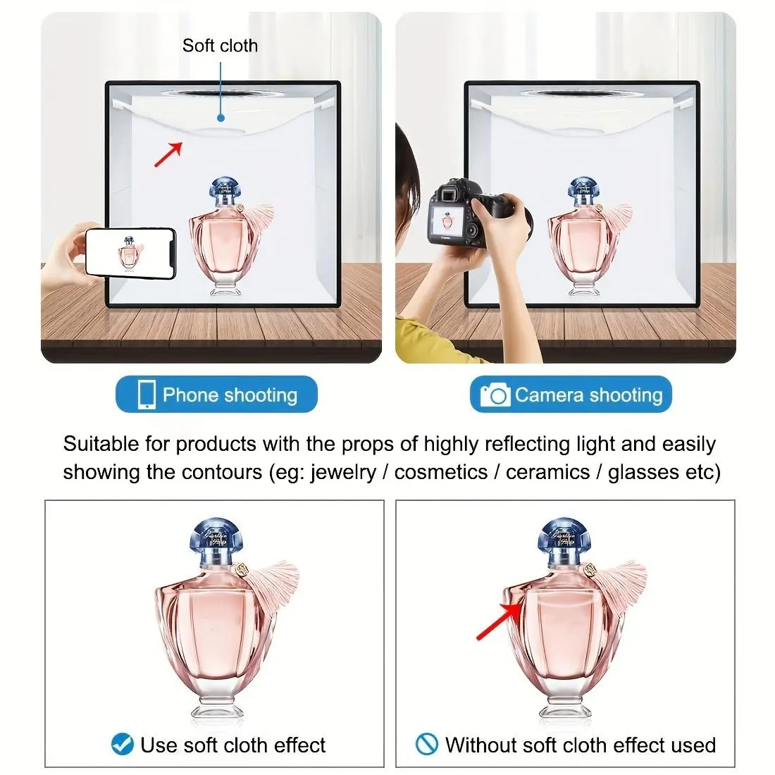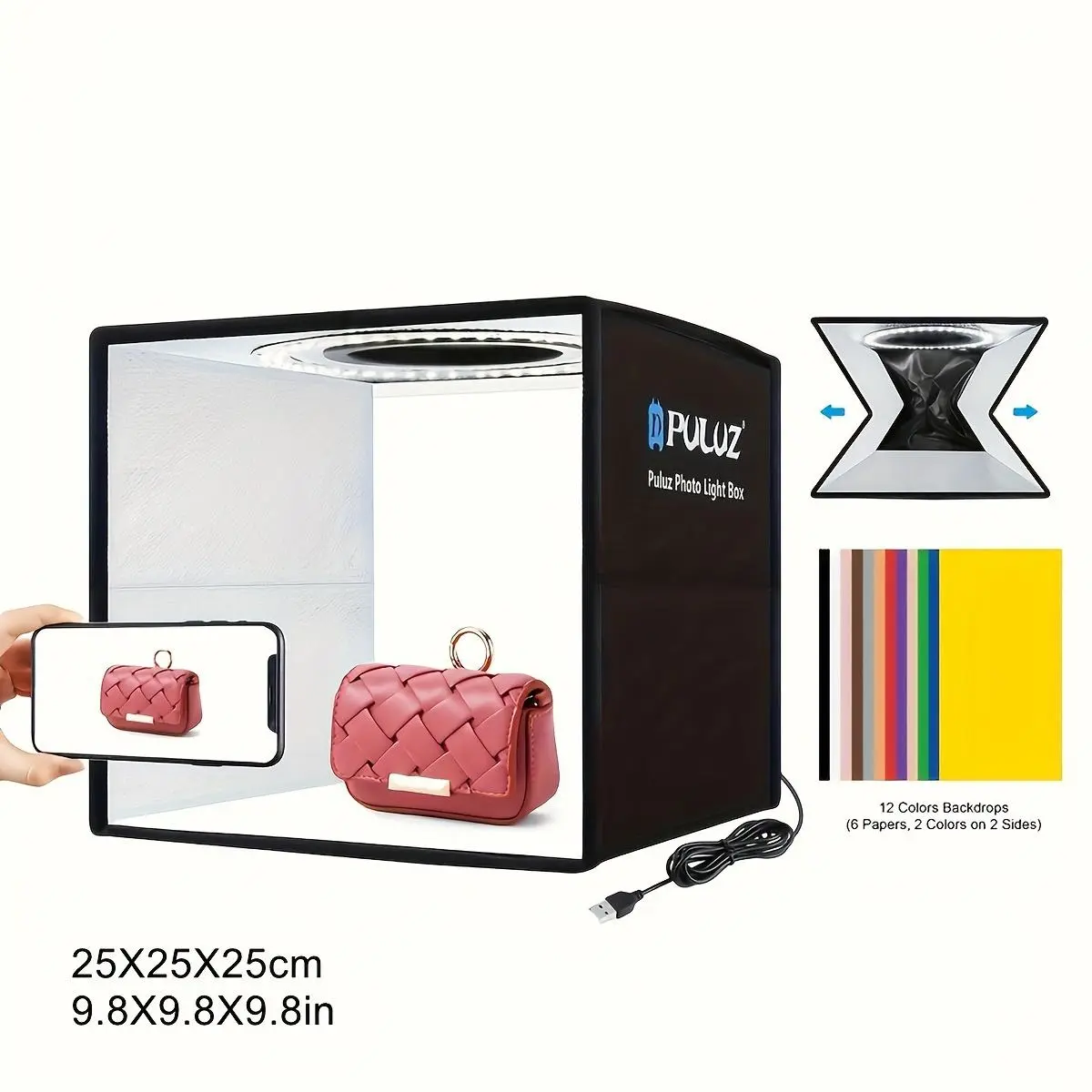 Ever struggled with poor lighting ruining your product photos or creative shots? The PULUZ Photo Studio Light Box is here to save your day (and your pics)! This 25x25cm portable studio kit folds up quickly, making setup a breeze whether you're at home or on the go. Inside, 96 bright LEDs with a high CRI of 95+ deliver consistent, soft light thanks to the included soft light cloth—no more harsh shadows or uneven brightness. Plus, the dimmable feature lets you tweak the lighting to match your mood or subject perfectly. You'll also get 12 vibrant backdrops to switch up your photo style effortlessly, from clean whites to bold colors. Compatible with phones, DSLRs, and USB ring lights, this kit adapts to your gear and creativity. Whether you're a budding photographer or just love snapping great shots, this foldable studio makes professional-quality photos easy and fun. Ready to brighten up your photography game? Grab your PULUZ Light Box and start shooting like a pro today!