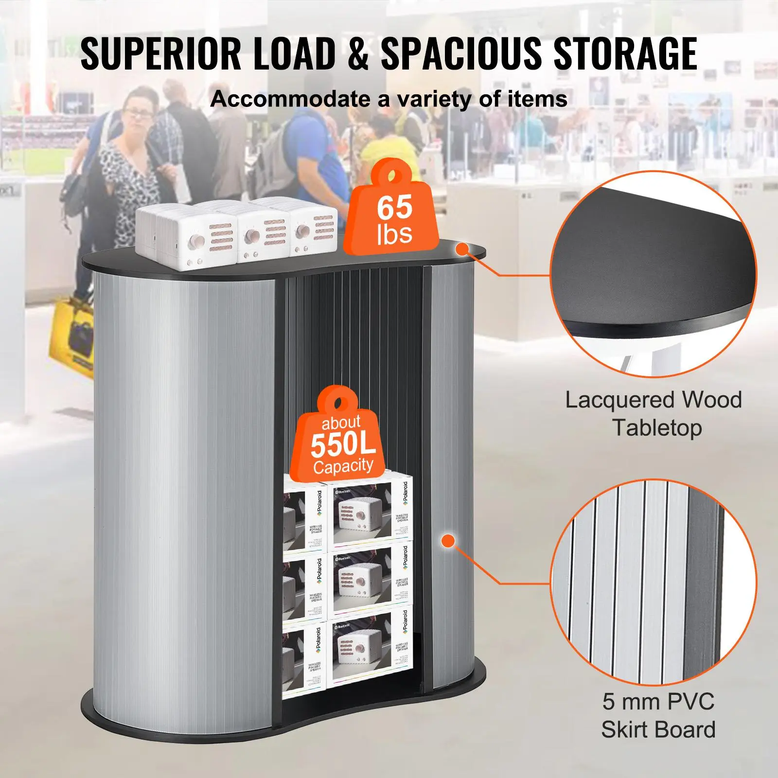 • Superb Weight Capacity & Spacious Storage: The trade show counter supports up to 65 pounds on the tabletop with its large-capacity hollow storage space. The spacious storage accommodates various items, ensuring organized displays.