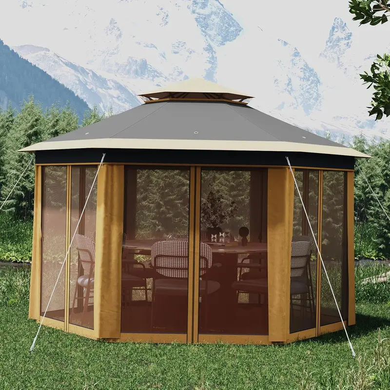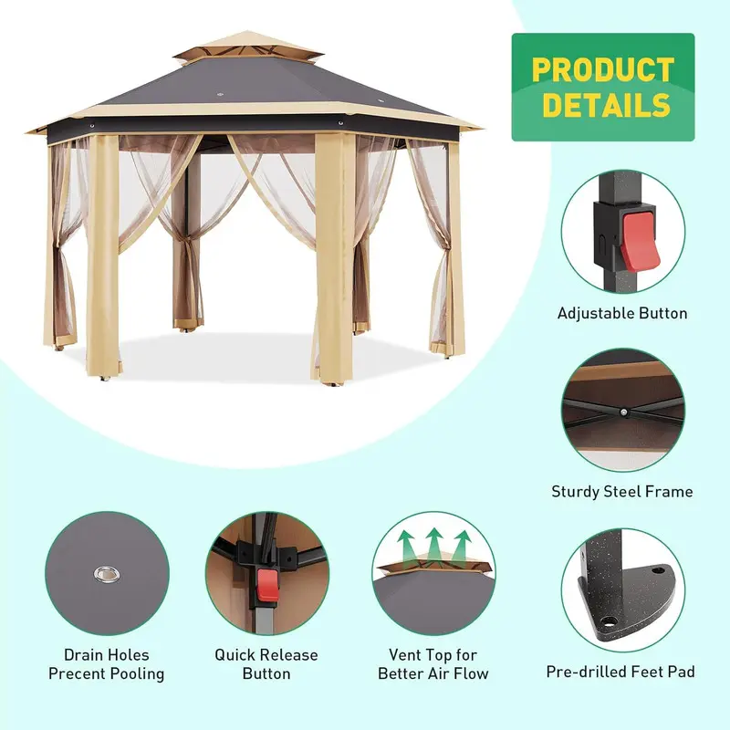 𝙎𝙥𝙖𝙘𝙞𝙤𝙪𝙨 & 𝙑𝙚𝙧𝙨𝙖𝙩𝙞𝙡𝙚 𝘿𝙚𝙨𝙞𝙜𝙣: Hexagonal shape provides 169 sq. ft. of shade, ideal for group gatherings, outdoor markets, or patio furniture. Adjustable height (6.2–9.2 ft) accommodates varying needs, and the ventilated roof design reduces wind resistance while promoting airflow.