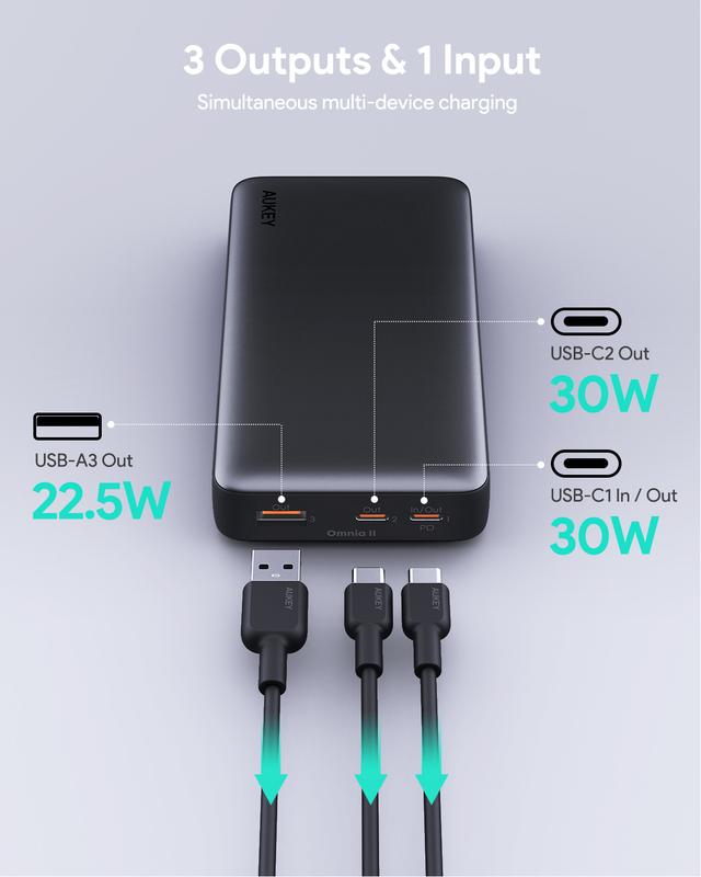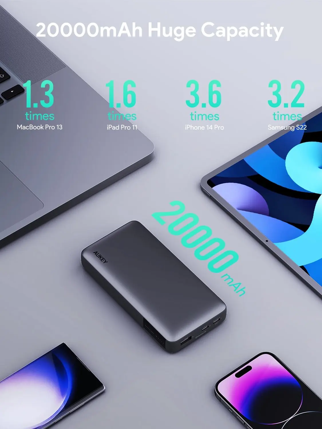 The AUKEY PB-Y42 Sprint X 30W 20000mAh Portable Power Bank is a powerful, large-capacity, and safe charging solution for smartphones, laptops, and USB C devices. It features an LED indicator for remaining power level and meets aviation safety standards. Perfect for travel, it ensures you stay connected and powered up.