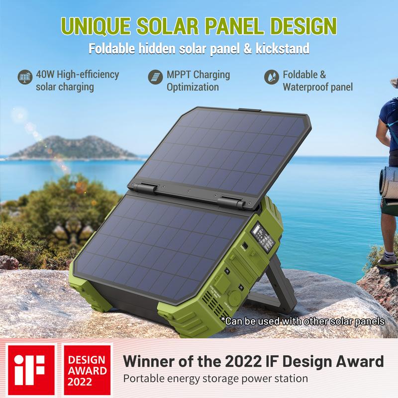 BROWEY portable power station features a foldable 40W solar panel, turning sunlight into clean energy anytime. This award-winning solar power generator won the 2022 German IF Design Award for its innovative design. Use it as a solar generator with panels included or connect to extra solar panels for faster charging—ideal for camping, RVs, fishing, and emergency backup power at home