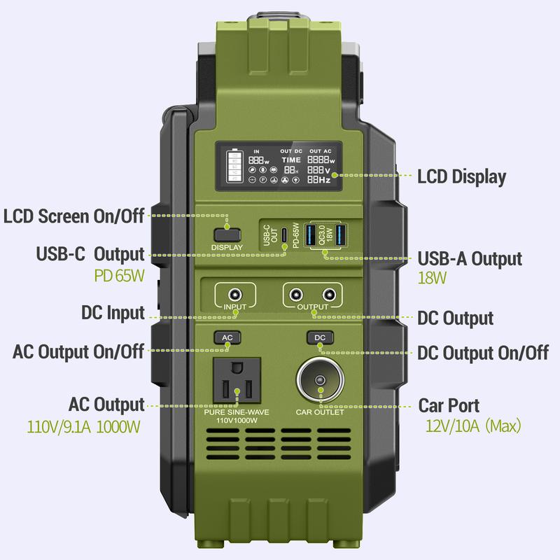 Charge your portable solar generator via AC adapter, car outlet, built-in 40W solar panel, or other solar panels (depending on sunlight strength). The LCD display shows remaining battery power, voltage, input/output power, fault indication, and more. Compact and easy to carry with a comfortable handle. The foldable stand of the camping power station is convenient for efficient solar charging.