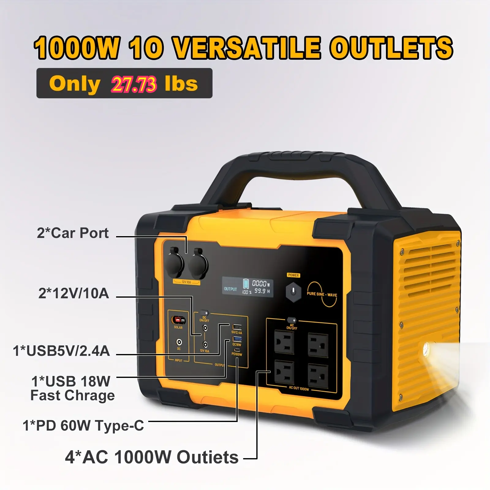 Equipped with 2 AC outlets (1000W each), 1 PD 60W USB-C port, 1 QC 18W fast charge port, 1 USB-A port, 2 12V/10A DC outputs, 1 DC input, and 2 car ports. It can recharge up to 10 devices simultaneously. A built-in LED light and display meet most needs.