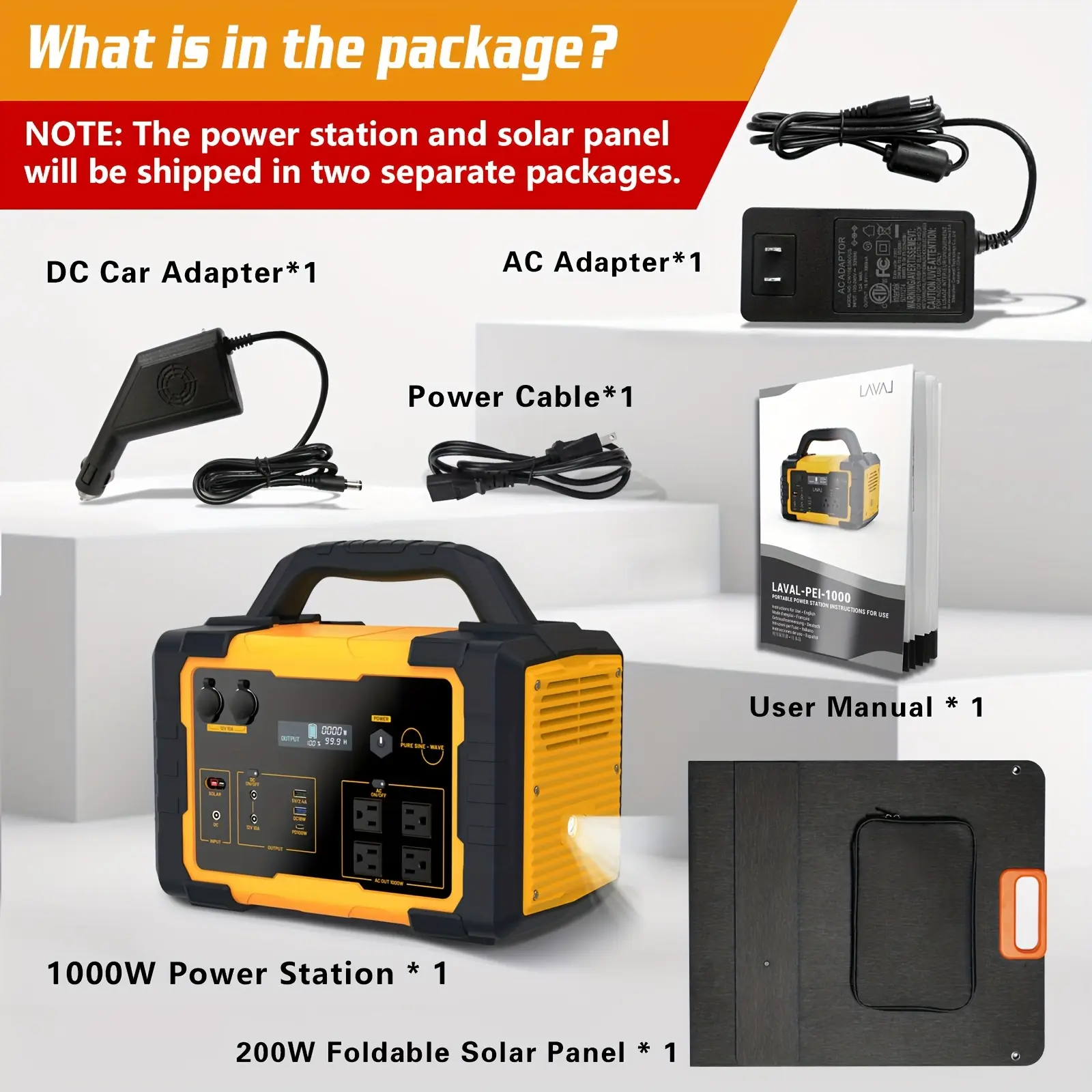 Your package includes: 1000W portable power station, AC adapter, car charger cable, and an instruction manual. Everything you need for reliable power on the go.
