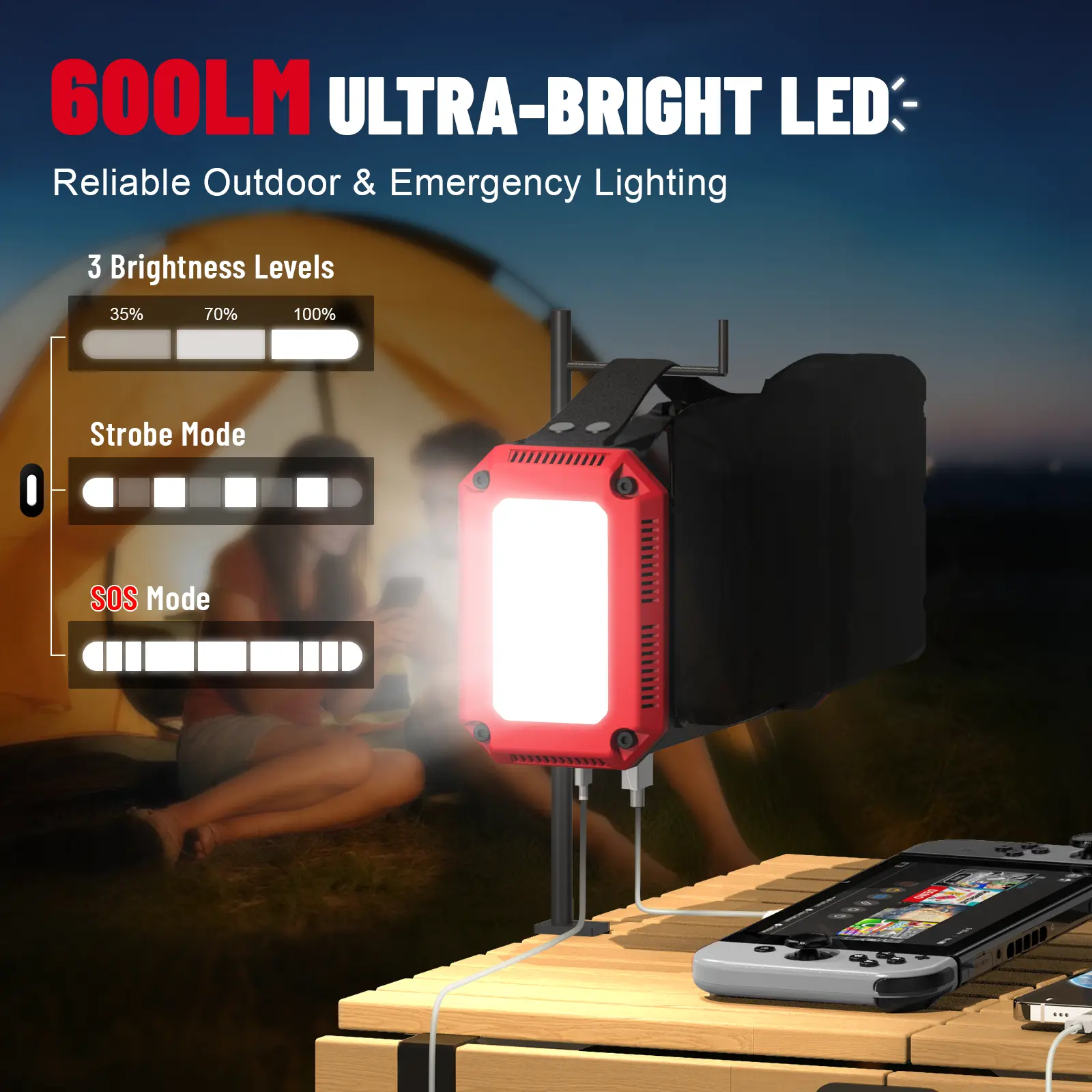 ·600LM LED Work Light Adjustable brightness levels: 35%, 70%, 100% + strobe & SOS modes. Perfect for camping, night work, hiking, and emergency situations.