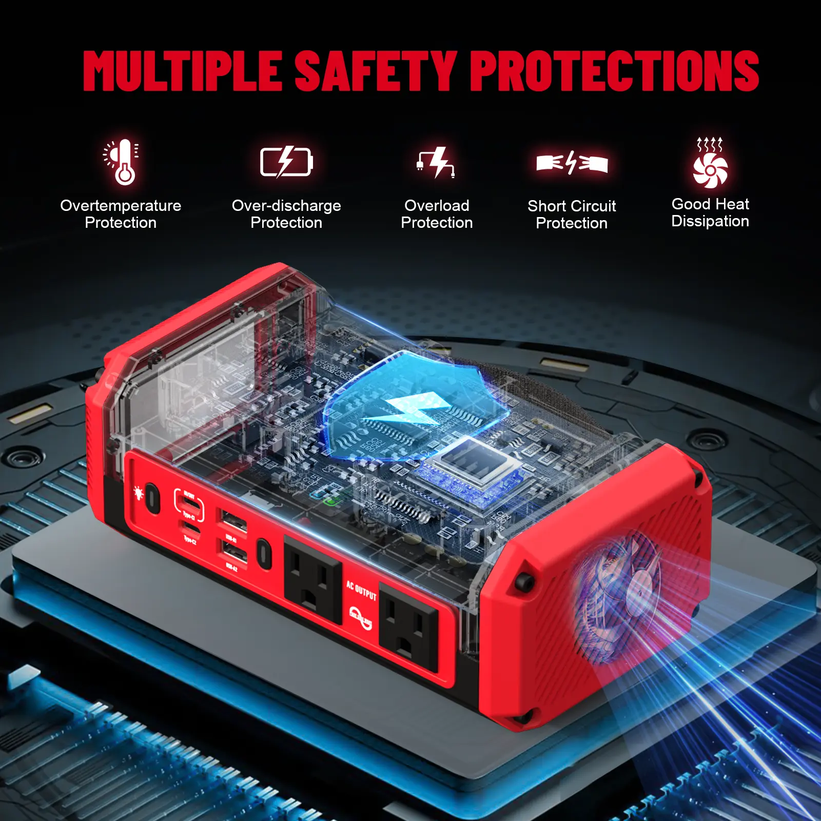 ·Enhanced Safety Features Protection against short circuits, overloads, over-discharge, overheating, and fault errors. Built-in cooling fan ensures stable and safe operation.