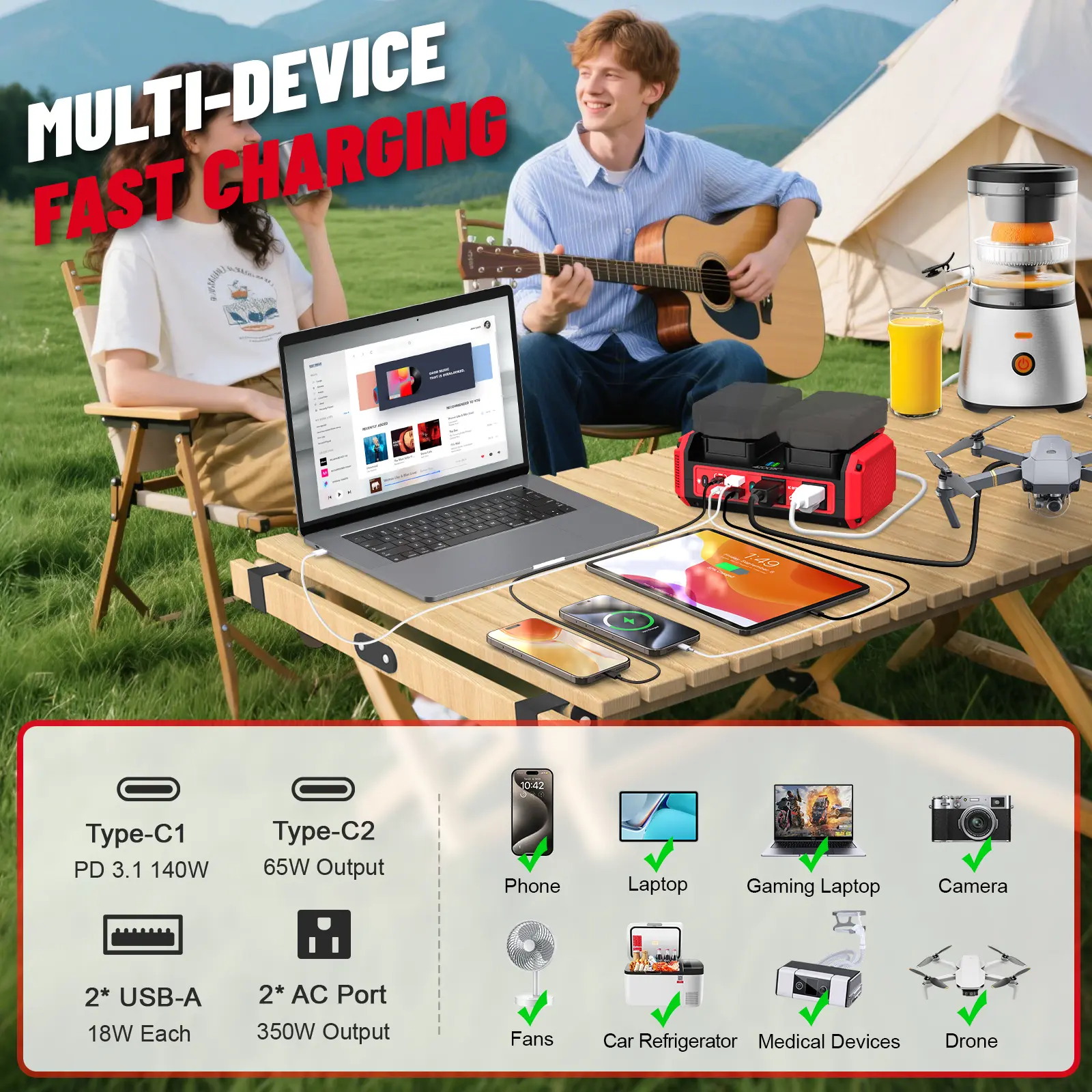 ·Multiple Fast Charging Ports 2 AC outlets, 2 Type-C ports (140W / 65W), 2 USB ports. Supports simultaneous charging for multiple devices. 140W Type-C port allows ultra-fast laptop/tablet charging.