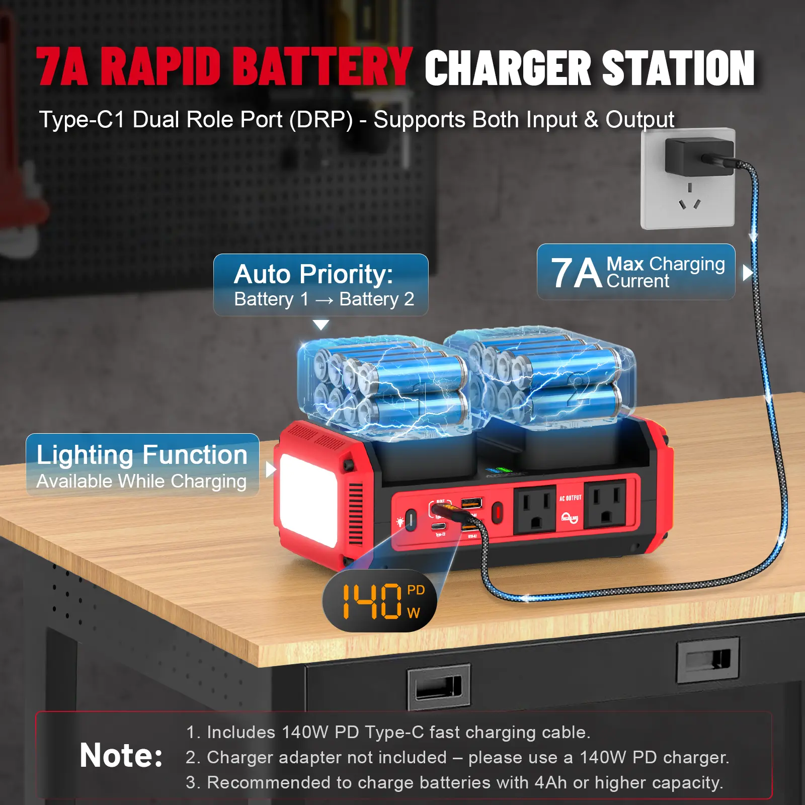 ·7A Fast Battery Charging Type-C Dual Role Port (DRP) can output power and recharge batteries simultaneously. Includes 140W Type-C charging cable.