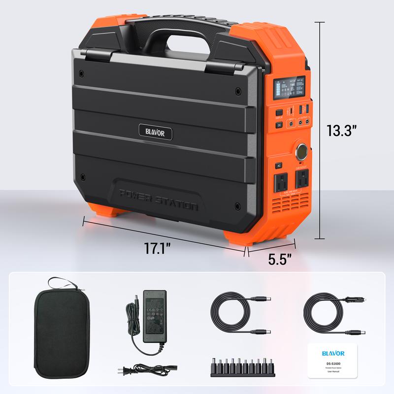 Package includes 1*BLAVOR 1600W portable power station with solar panel, 1* DC power cord, 1*car charging cable, 10 adapter heads, and 1*user manual