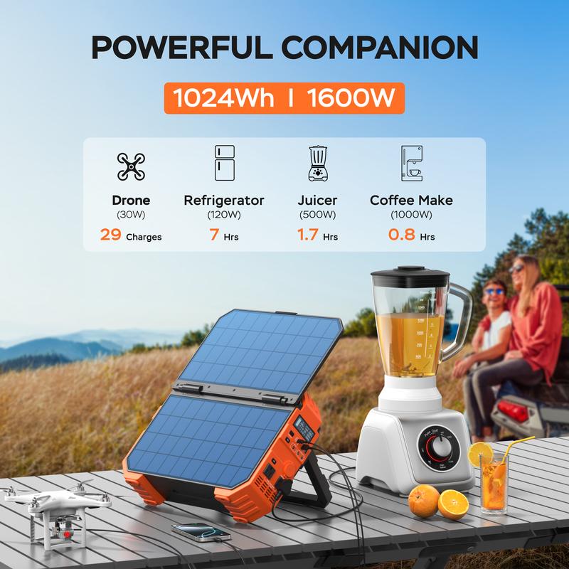 This 1024Wh portable solar power station delivers 1600W rated output (3200W surge), enough to run 90% of your appliances. Perfect as a home backup battery or camping power station, it can power coffee makers, CPAP machines, refrigerators and more. With 8 versatile outlets, this solar generator for home and outdoor use keeps multiple devices running simultaneously