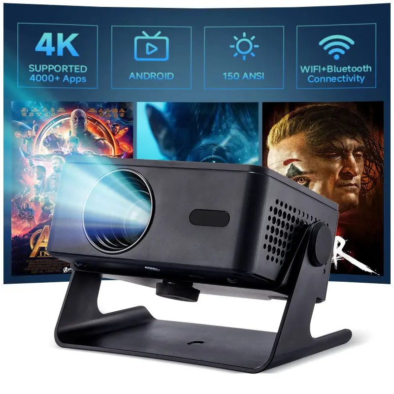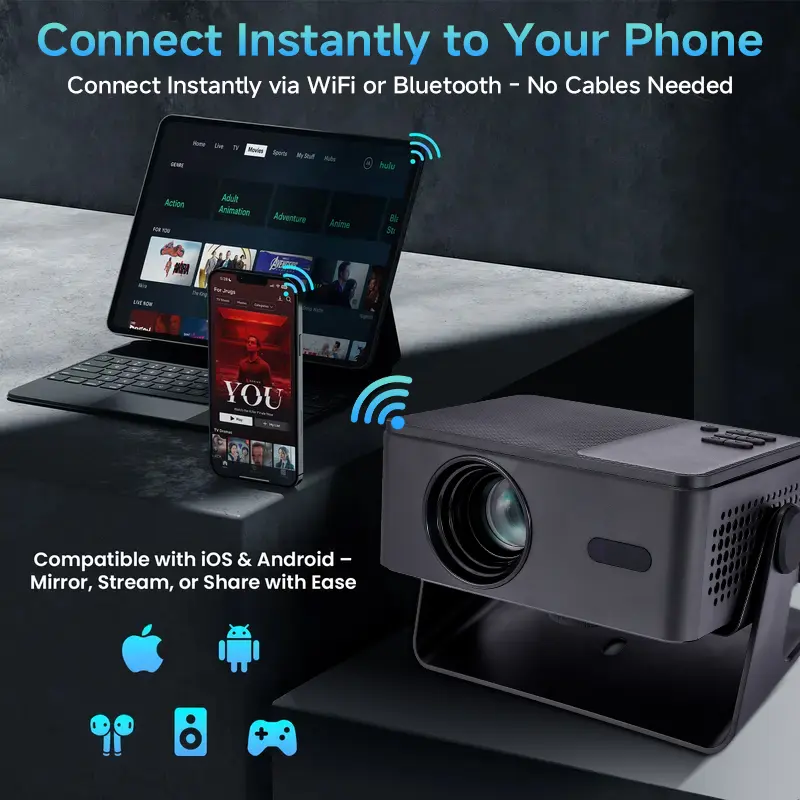 Achieve crystal-clear focus instantly with the electric remote focus system (F+/F-). Faster and easier than traditional manual focus. The included 360° rotatable stand allows projection on walls, tables, or ceilings, making setup effortless in any environment