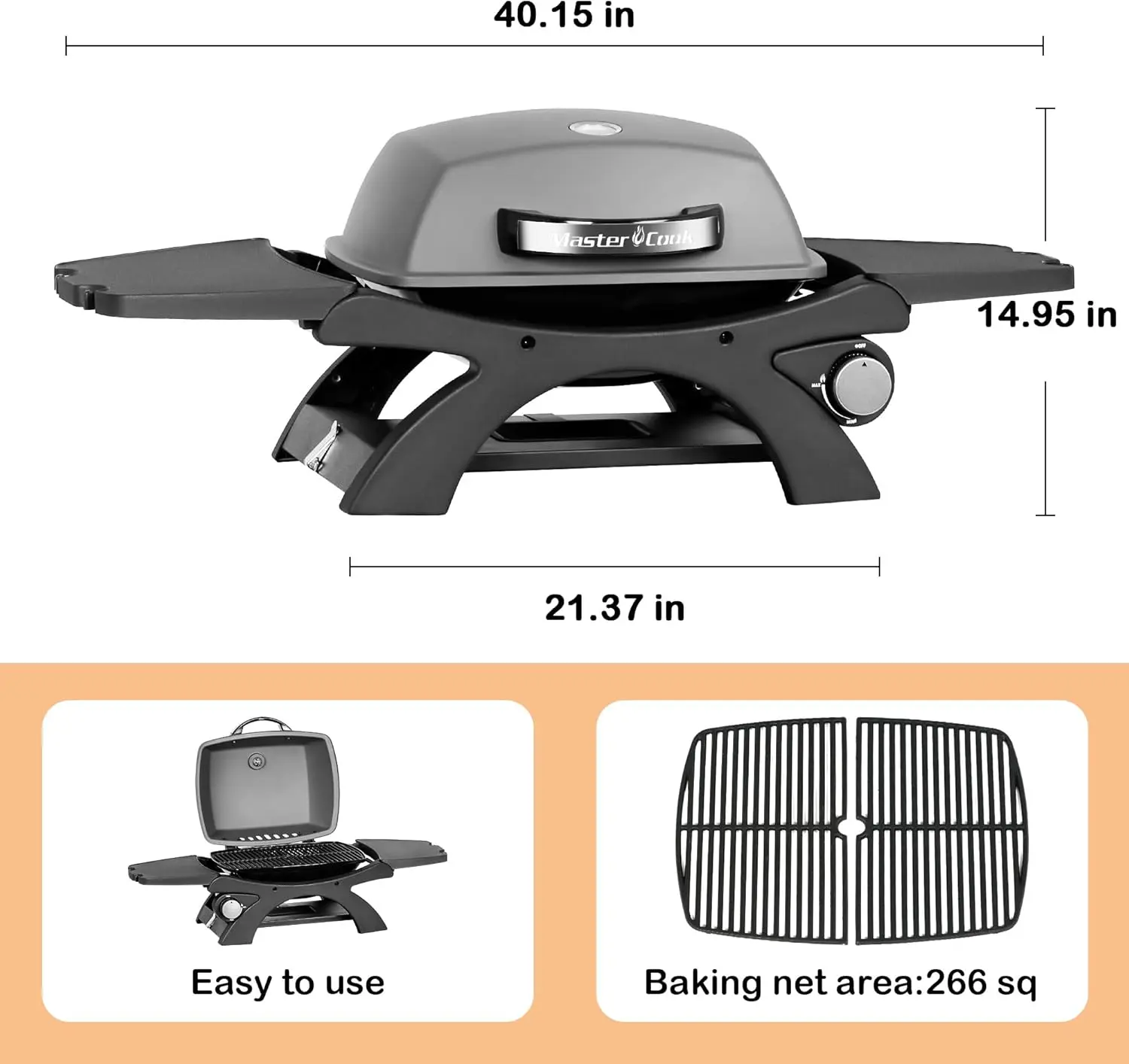 ·Grill Grates: Two cast iron grates for cooking meats, seafood, or veggies on a 266 sq in cooking space.