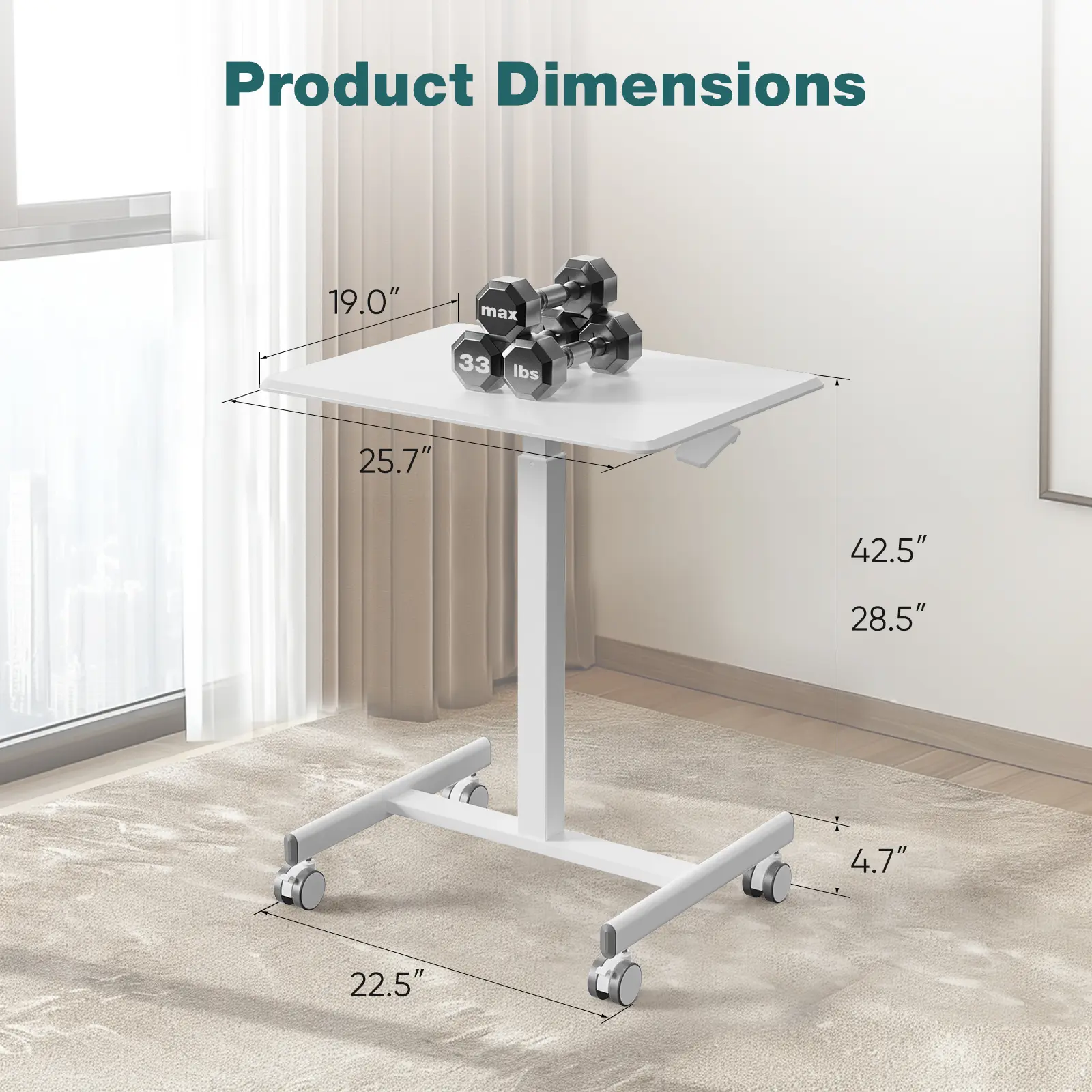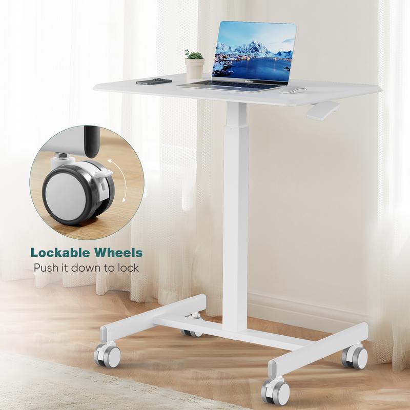 Adjust the height of this mobile standing desk quickly and smoothly from 28.5 to 42.5 inches with a simple press of the handle thanks to the efficient gas spring system. Say goodbye to prolonged sitting and enjoy the health benefits of standing, such as improved focus, reduced back pain, and weight loss.