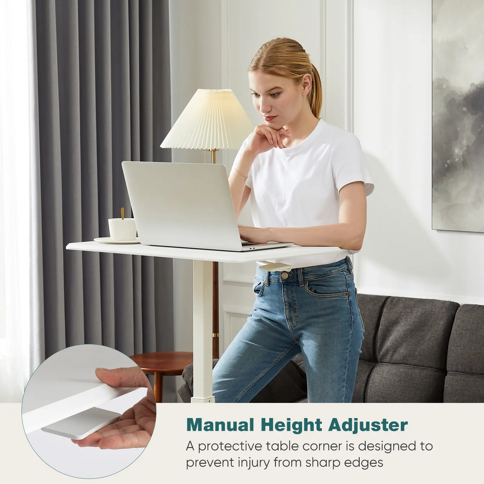The collapsible single-column structure and simple base design help save space while providing ample leg room when seated. The wheels with brakes allow you to stop the desk wherever desired and easily slide it under a sofa or bed, minimizing floor space while maintaining a spacious work area.