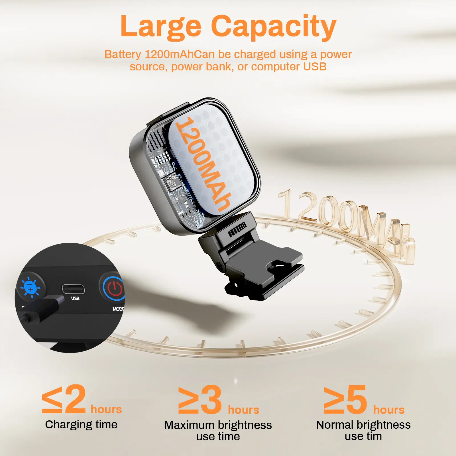 ·2H Charge for 5H Use: The selfie light has a built-in rechargeable battery which can be used for 5 hours at 50% brightness after 2 hours full charge. Led phone light can be charged by most devices that support USB port or Type-C port, such as laptops, PCs, mobile power, USB chargers, car chargers, etc. Note: For video conferencing, it is recommended to plug in USB power for higher brightness.