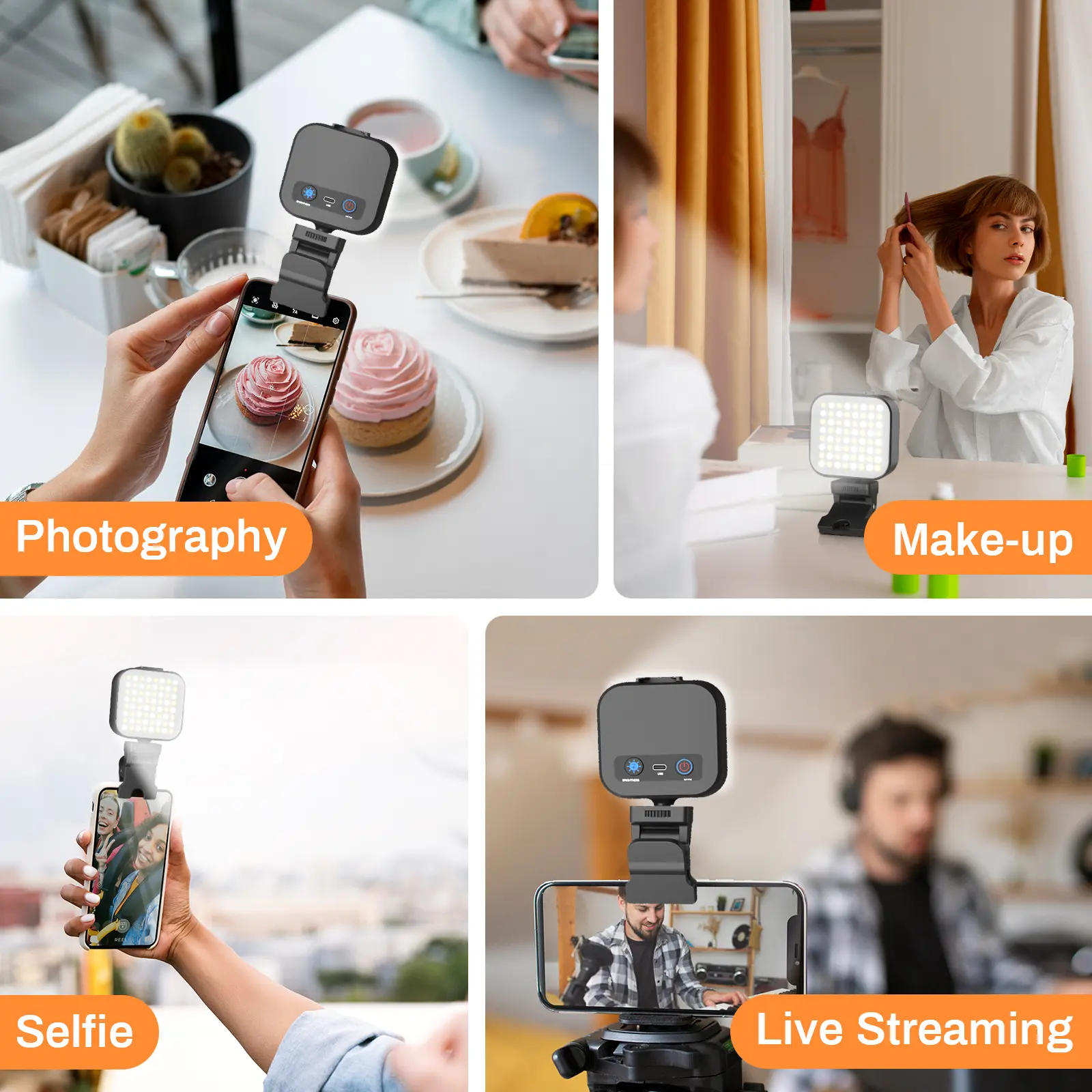 ·5 Light Modes & 5 Brightness Levels: This phone light has 5 light modes ( warm, warm white, natural white, daylight, cool white) color temperature range from 3200K to 6500K. 64 high quality LED light beads provide 5 brightness levels from 10% to 100%, perfect solution for night lighting. Whether indoor or outdoor, day or night, it can illuminate your beauty at any time.