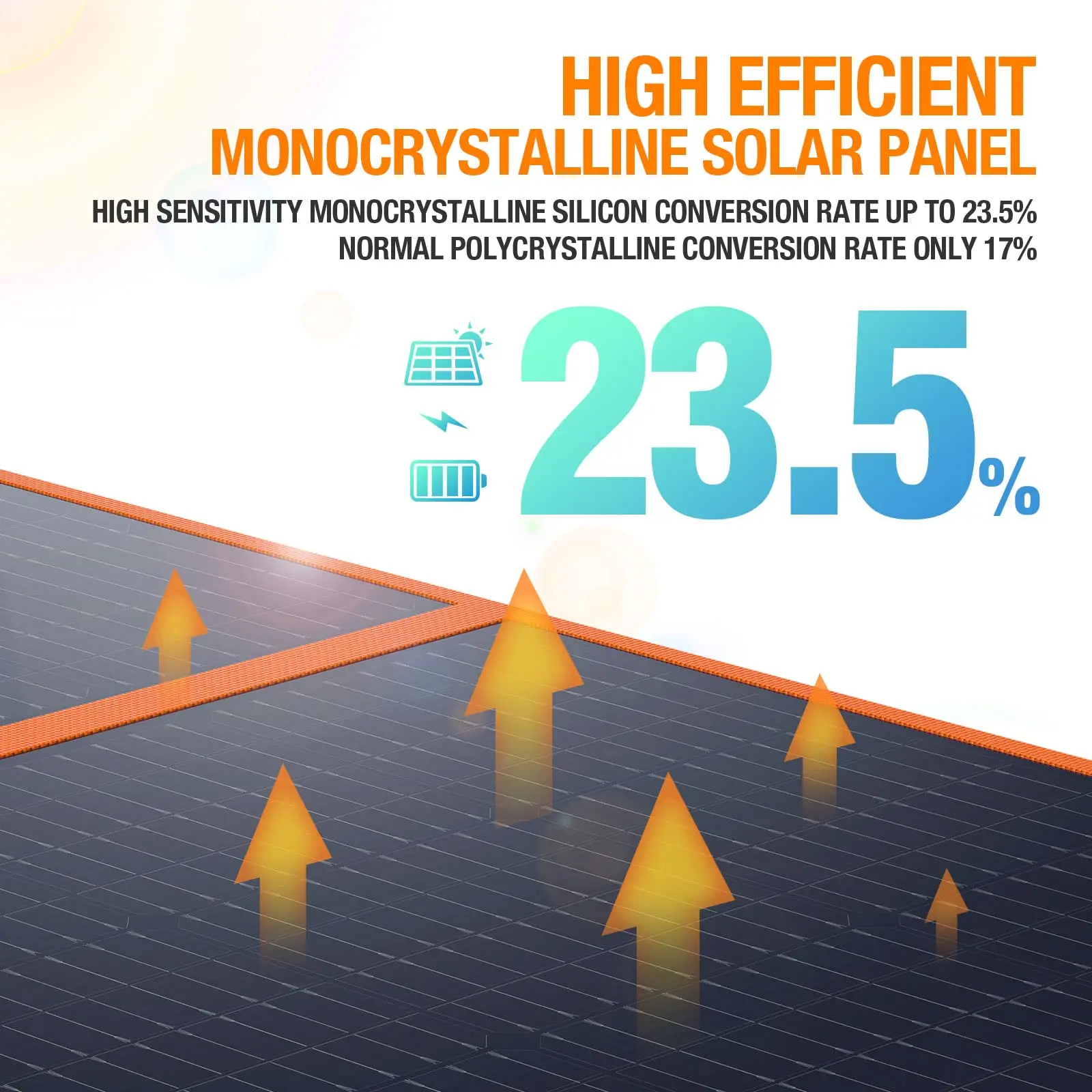 High Cell Efficiency - Up to 23.5%: 200W solar panel, covered by monocrystalline silicon solar cells, conversion rate up to 23.5%, normal polycrystalline conversion rate only 17%, much higher efficiency than other normal solar panels.