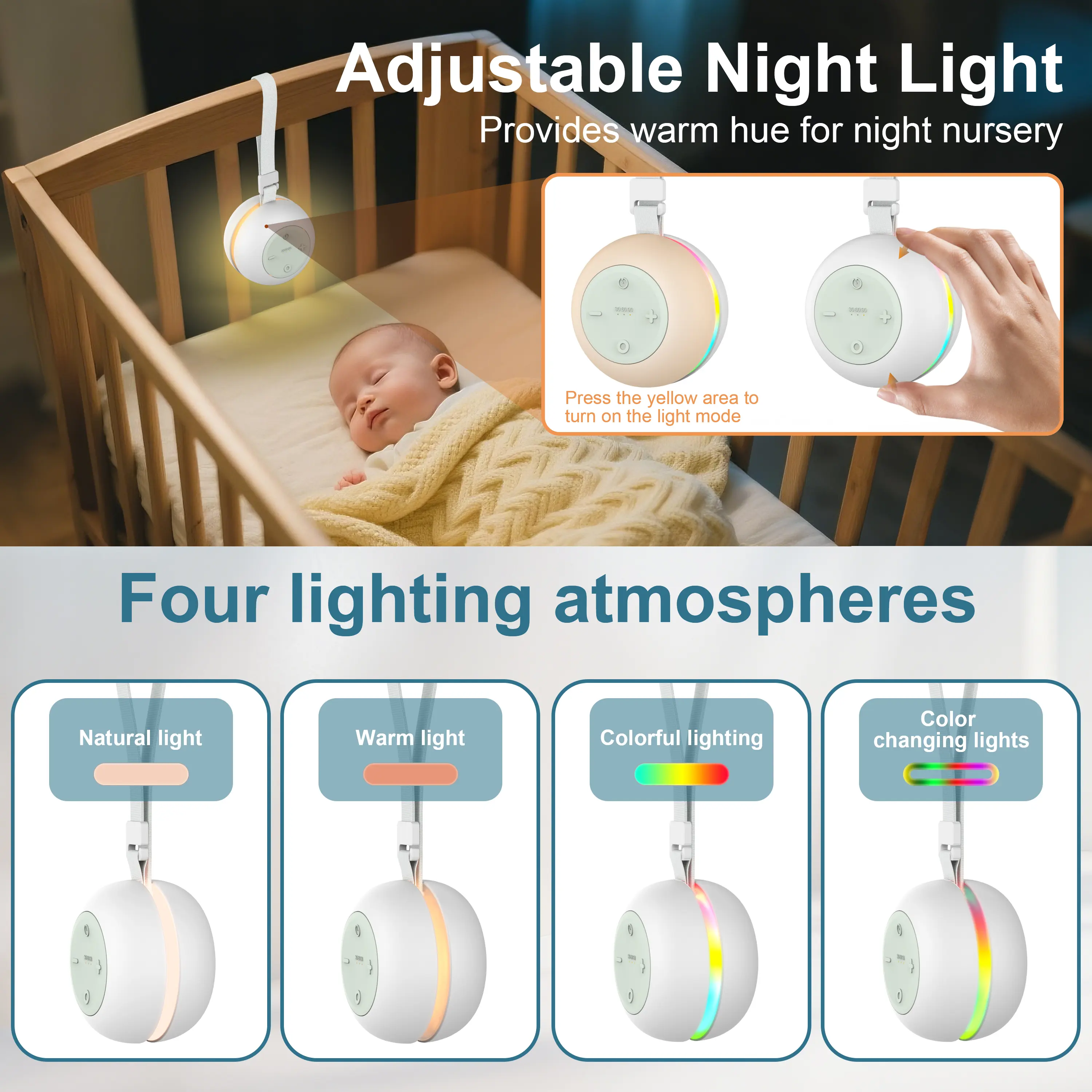 ·VERSATILE LIGHTING: 256-color RGB mood light with adjustable brightness settings, perfect for creating a soothing atmosphere in bedrooms, nurseries, or any living space.