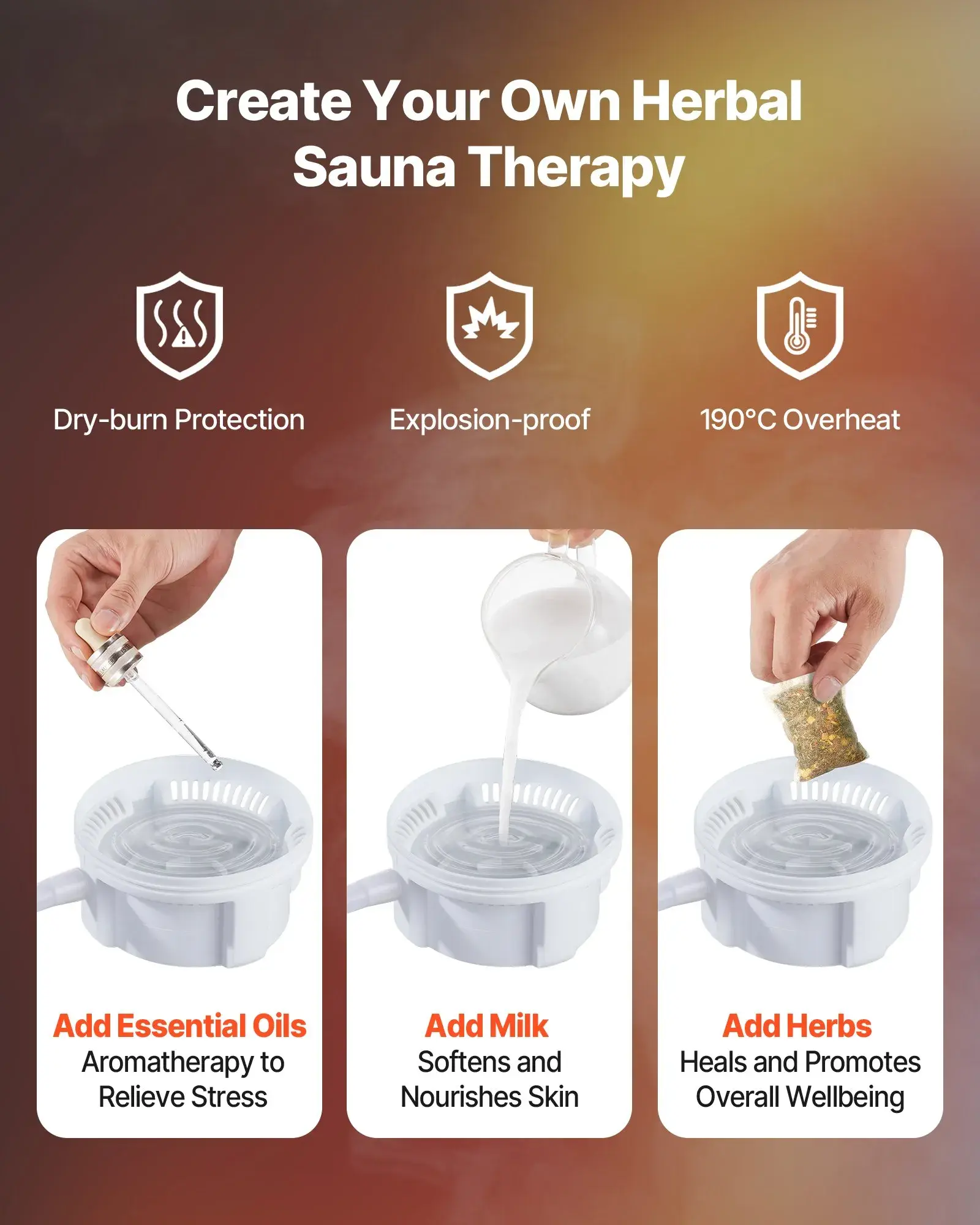 Add essential oils, milk, or herbal packs to the 2.6L steam pot. Features adjustable steaming duration and dry-burn protection. Ensure secure and comfortable use.