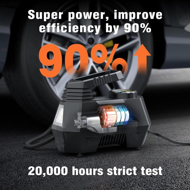 This air compressor operates on 12V DC power, ensuring convenience and portability. It features a 120W motor and a maximum pressure of 150PSI. The air flow capacity is 22 LPM, providing efficient inflation. The included components include a user manual, tire inflator, nozzle, and inflator hose. It's a corded electric device, making it reliable and easy to use.