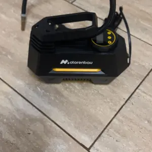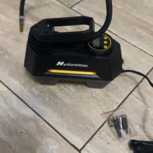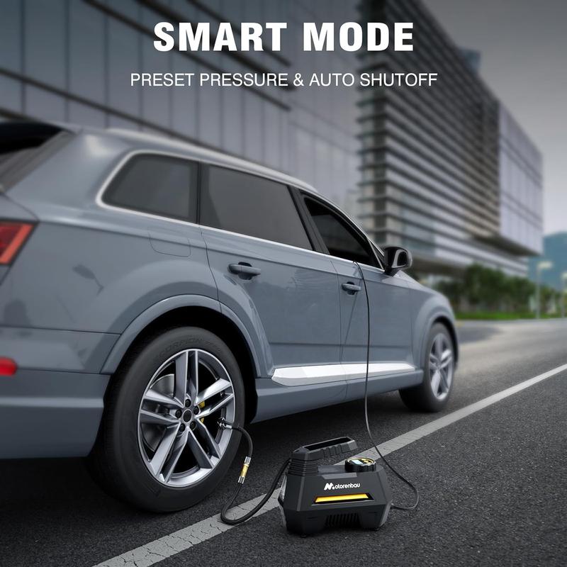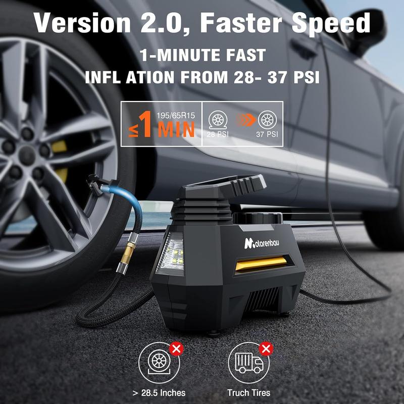 Motorenbau's portable air compressor offers a modular design for wide compatibility. It comes equipped with multiple nozzles and hoses, perfect for inflating cars, motorcycles, swimming rings, and balls. No need for additional accessories. The inflation speed varies based on tire size, air humidity, and temperature. Ideal for tire inflation needs.