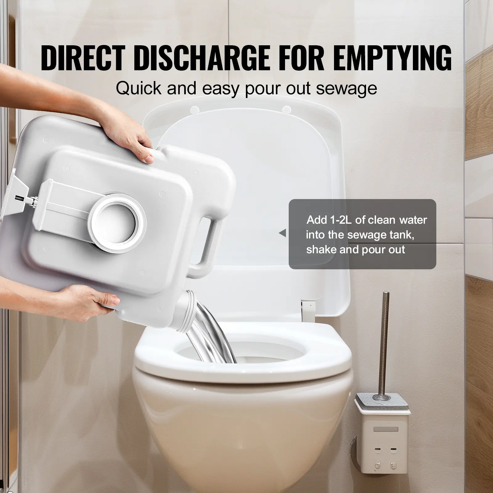 • Easy to Empty and Clean: Featuring a straight discharge outlet design, there's no need for extra complicated operations—just add water, shake, and pour out the waste directly. The toilet seat and lid can be individually removed for easy cleaning.