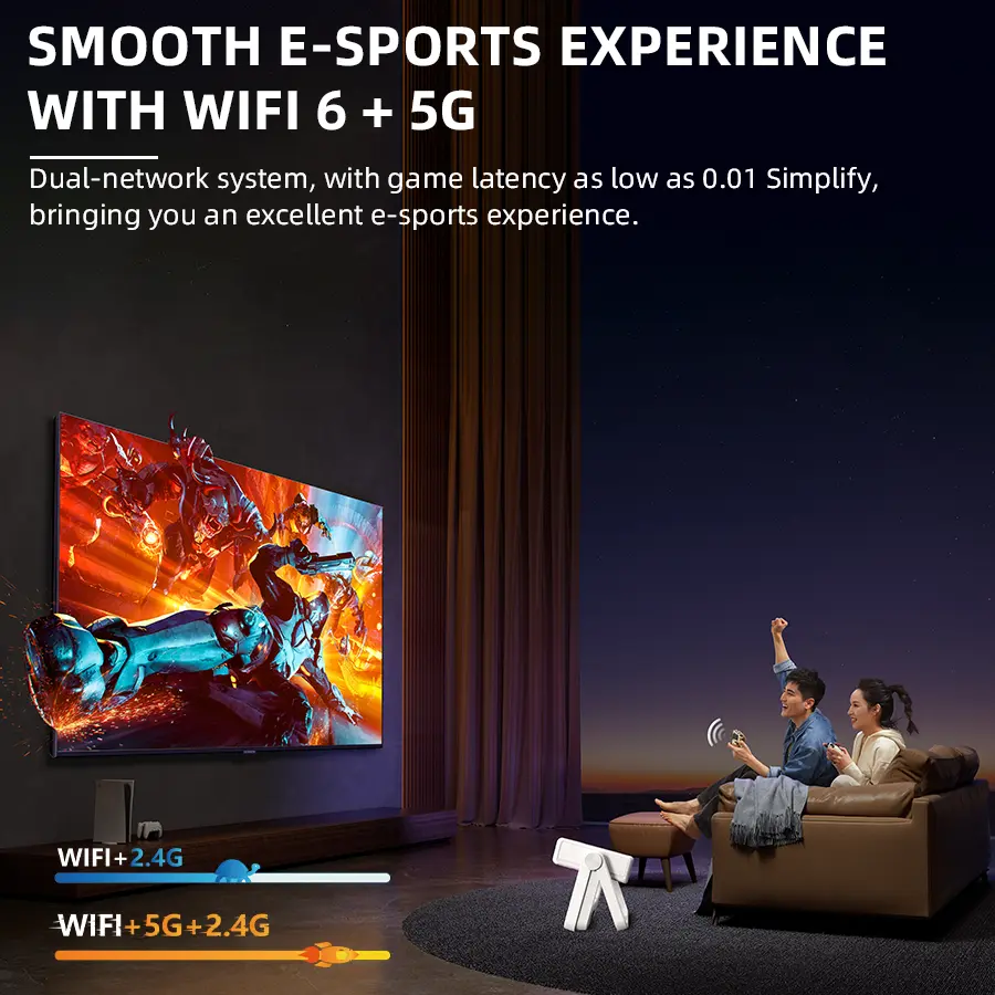 [Smart Android + Fast Connection] The XBJ portable smart projector comes with built-in Android OS and apps. Dual-band WiFi 6 ensures low-latency streaming, and Bluetooth 5.2 connects to speakers or headphones for an immersive audio experience. For parties or meetings, connect your game console or laptop via USB or HDMI.