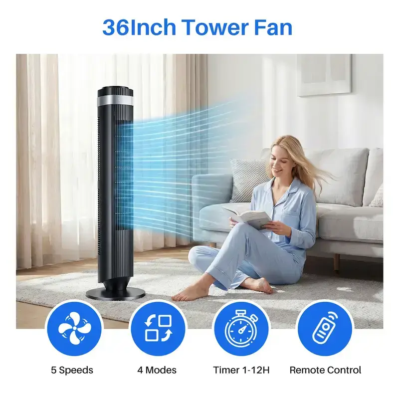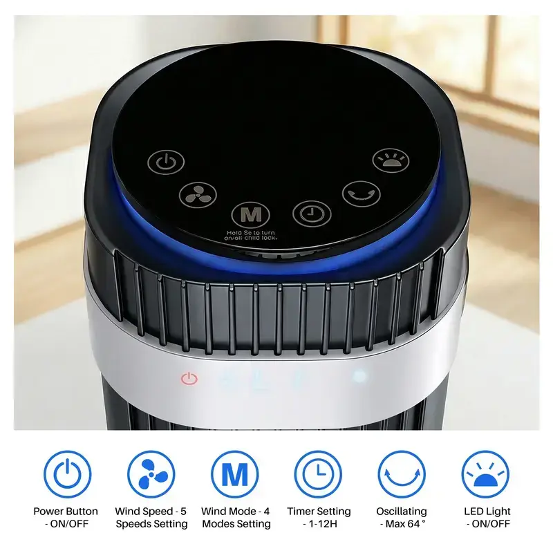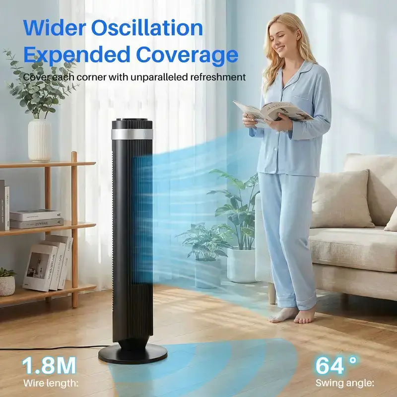 Standing 36.6 inches tall, this slim cooling fan fits easily into bedrooms, living rooms, or home offices without taking up much space. Built-in child lock, secure safety grille, LED display, portable handle, and remote storage slot provide added convenience and peace of mind for households with kids or pets.