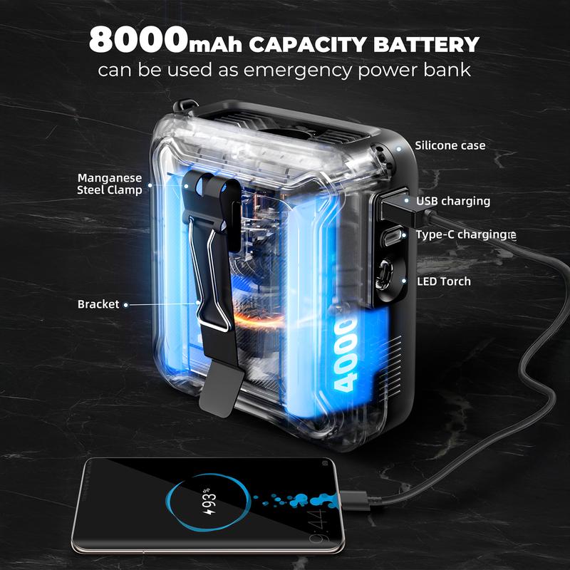 ·DURABLE & SAFE: This fan is designed with a protective silicone outer shell, offering shock resistance, drop protection, and sweat resistance. The anti-slip manganese steel clips prevent rust, while the dual-sided clips ensure a secure grip. Plus, the built-in LED light features an SOS flashing function for added safety. Thoughtfully designed with outdoor use in mind to meet yout need.