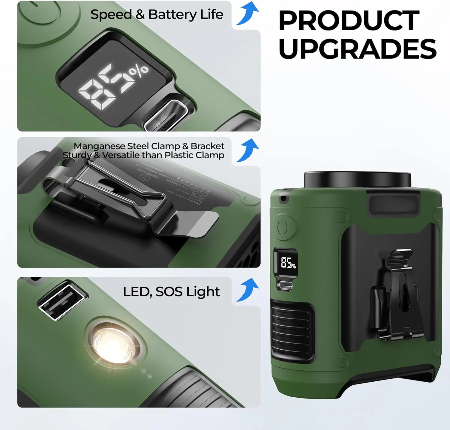 Long-Lasting Rechargeable Fan – This waist clip fan is equipped with a powerful 10,000mAh battery that delivers up to 40 hours of cooling on low speed and 8 hours on high. An LED display shows battery life, and it even features a USB output to charge your phone in emergencies.