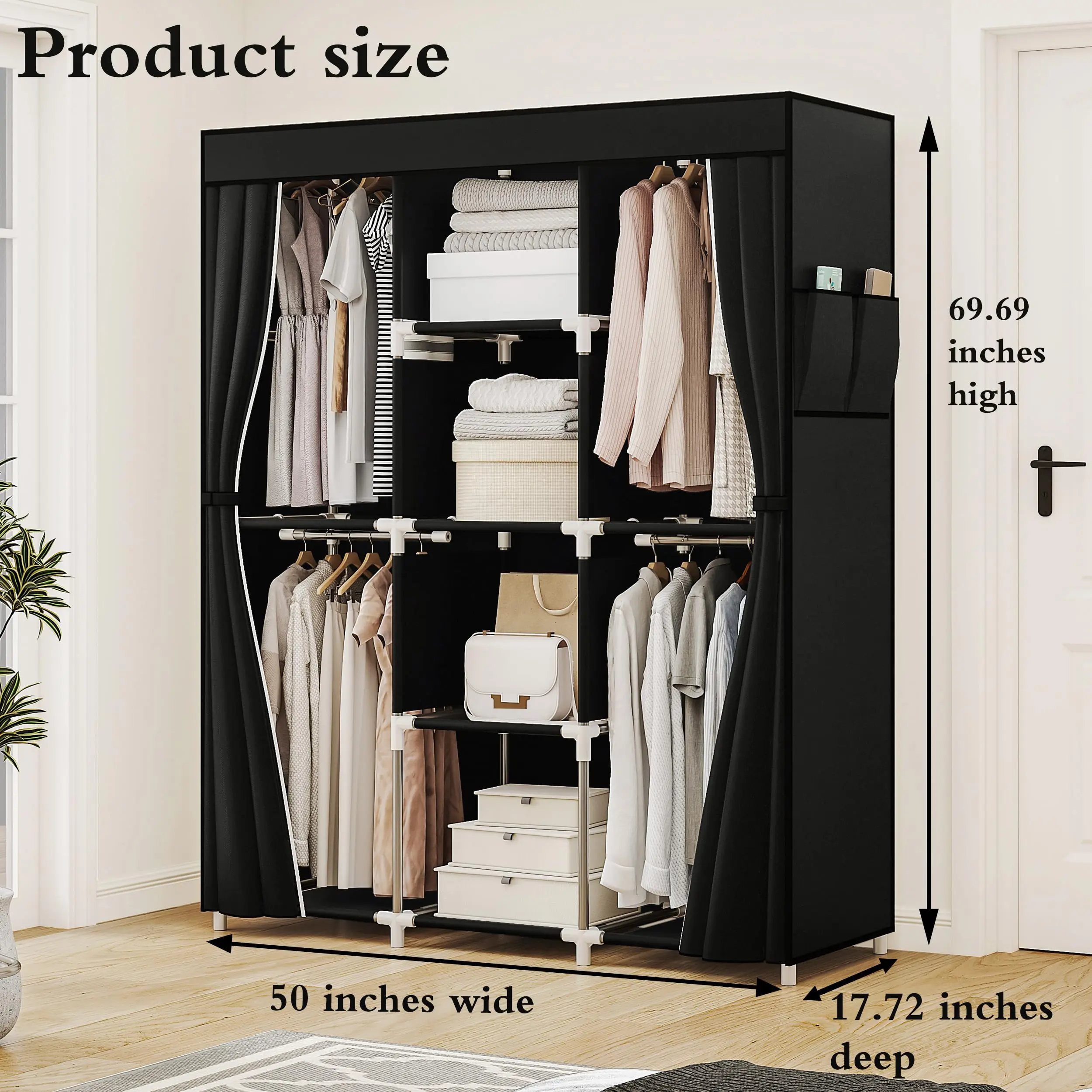 ·Ample storage space: This portable wardrobe measures 50 inches wide x 17.72 inches deep x 69.69 inches high. The 4-layer wardrobe rack can maximize the storage area, ensuring that you have enough space to store household items, clothes, books, personal favorite items, etc., and there are 4 larger storage spaces for longer clothing such as skirts. This portable wardrobe has a simple structure and neutral colors, which can be seamlessly integrated into any room in your home, whether it is a bedroom, living room or entryway, allowing you to say goodbye to clutter.