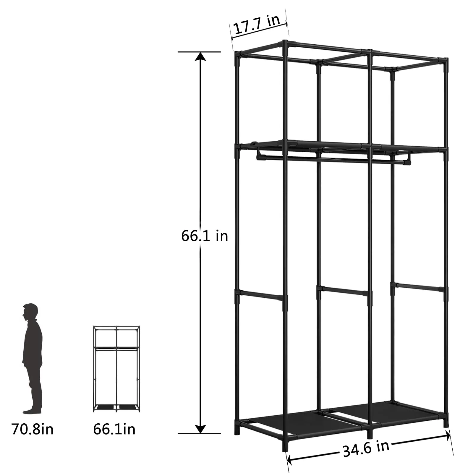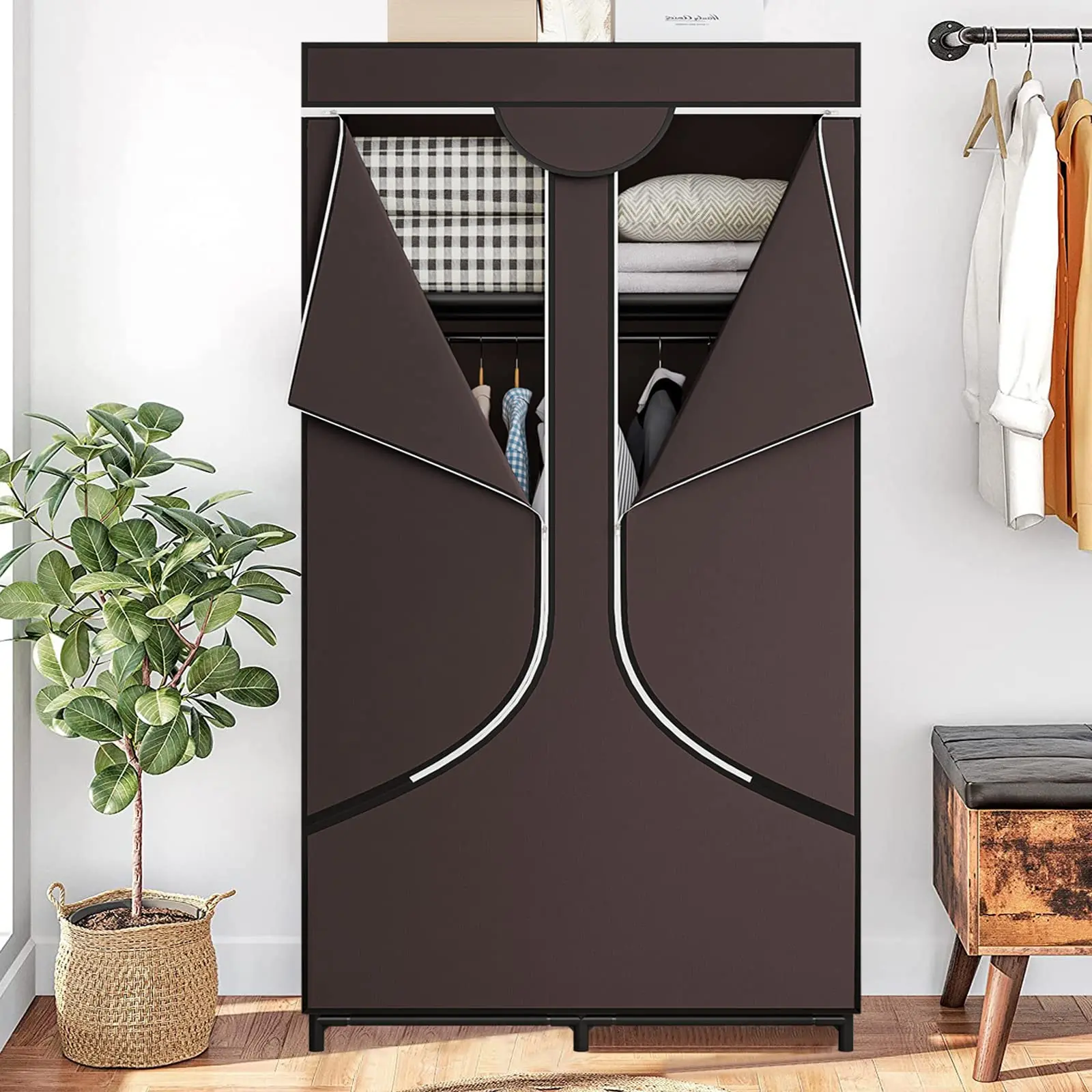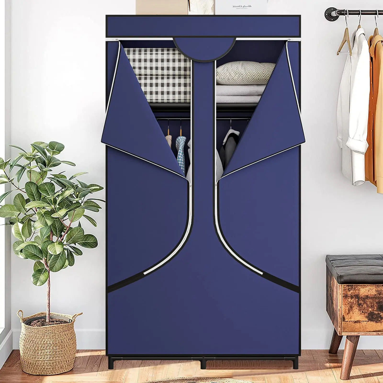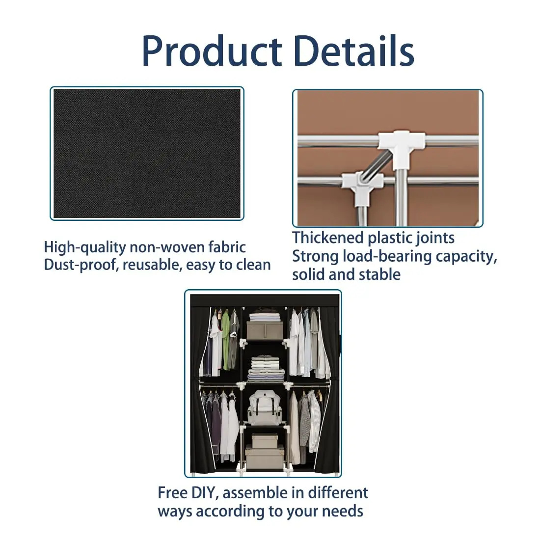 ·Metal frame with strong bearing capacity. Thickened iron pipes and reinforced plastic connectors greatly improve the bearing capacity of the wardrobe. It is sturdy and reliable, so please feel free to use it.
