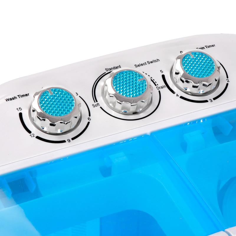 A practical 2 in 1 twin tub design can save your time by washing and spinning dry loads at the same time. Total Capacity: 9.9lbs | 5.5lbs Wash Capacity + 4.4lbs Spin Capacity, perfect for washing small loads quickly and efficiently.